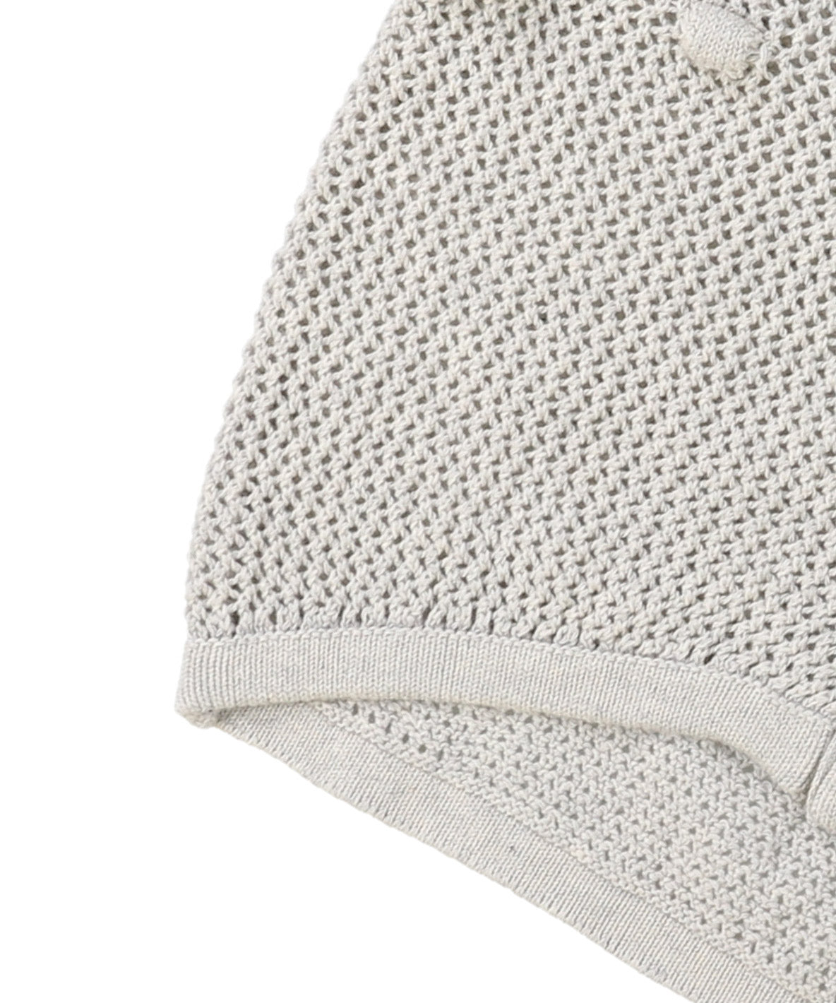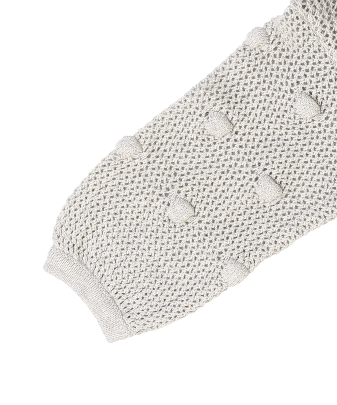 コットン100%の糸で編み上げたニットです。玉編みと透かし柄を組み合わせました。アイレットが軽さをプラスし、ドットが可愛い編地のサマーニットです。袖と身頃に丸みを持たせたバルーンシルエットのカーディガンです。