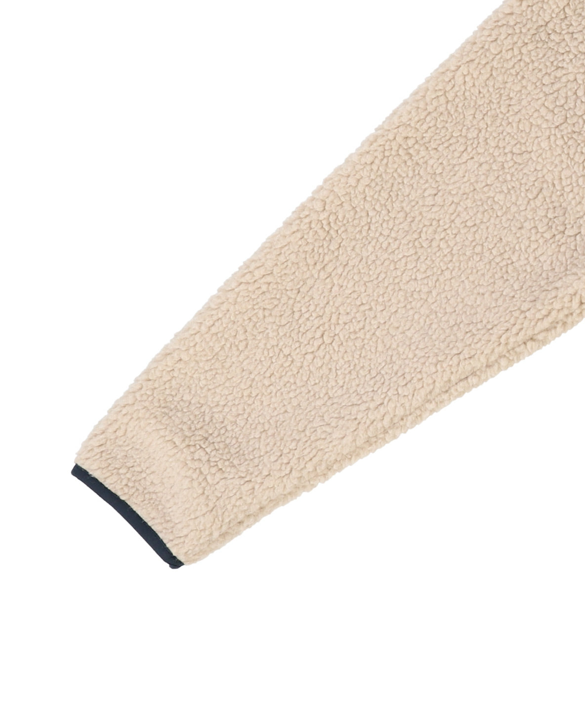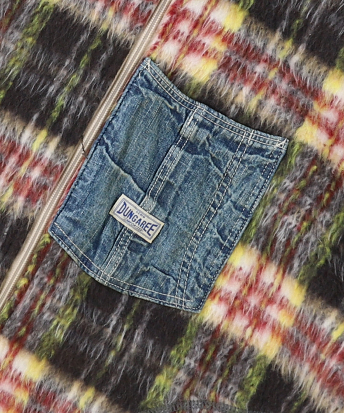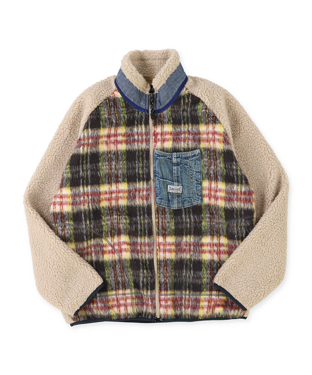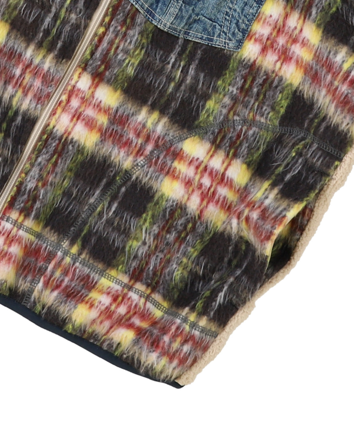 前に毛足の長いシャギーチェック、後はボアのパッチワーク 。胸に加工感のあるデニムのポケットが付き一お洒落さと機能性を兼ね備えた一味違うボアフリースジャケットです。