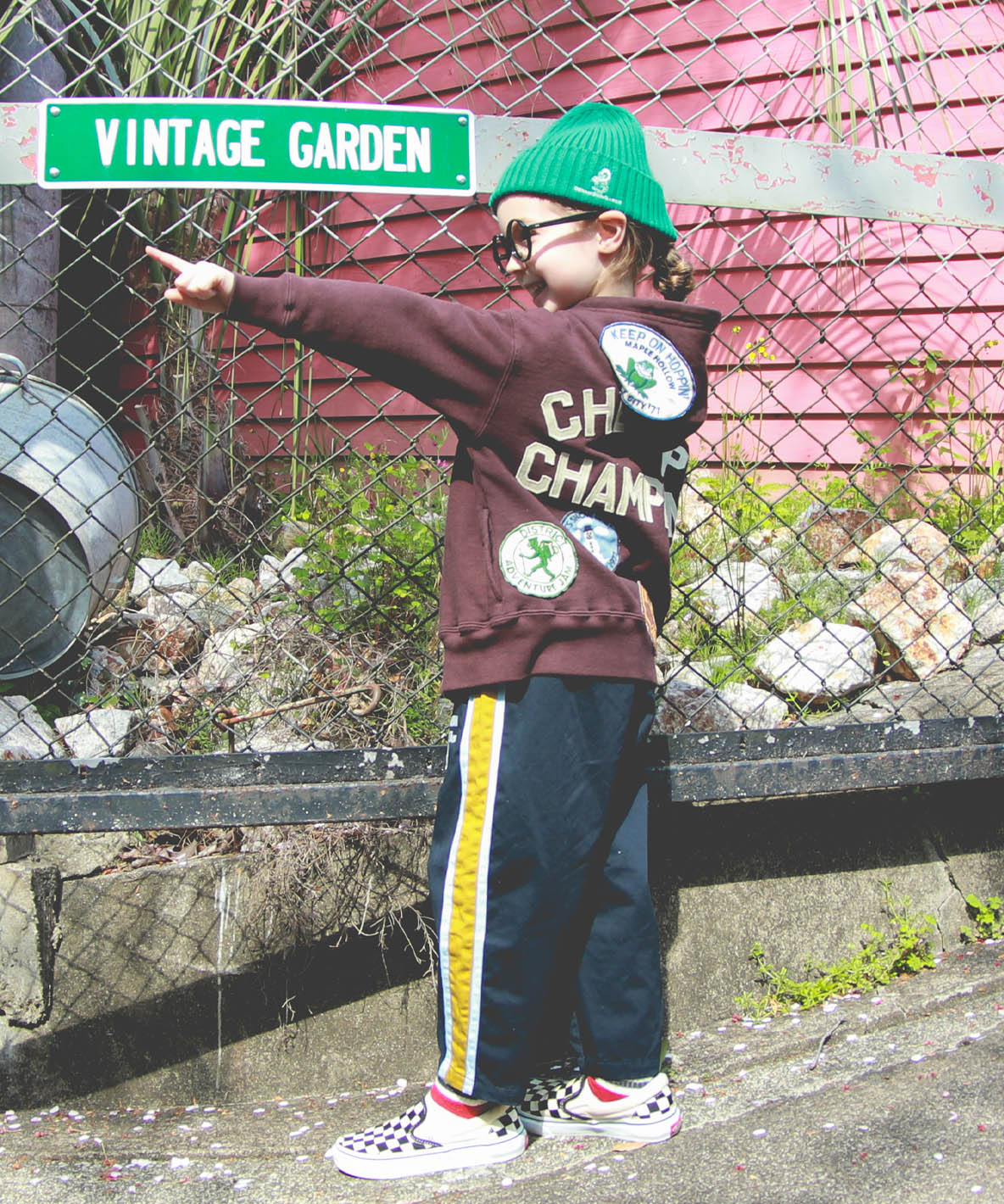 アメリカ陸軍のチノ・パンツをベースボールパンツ風に脇に配色の切り替えを足し、チームキャラクター(架空)をプリント。ウエストをゴム仕様にリサイズしたという設定のリメイクパンツです。