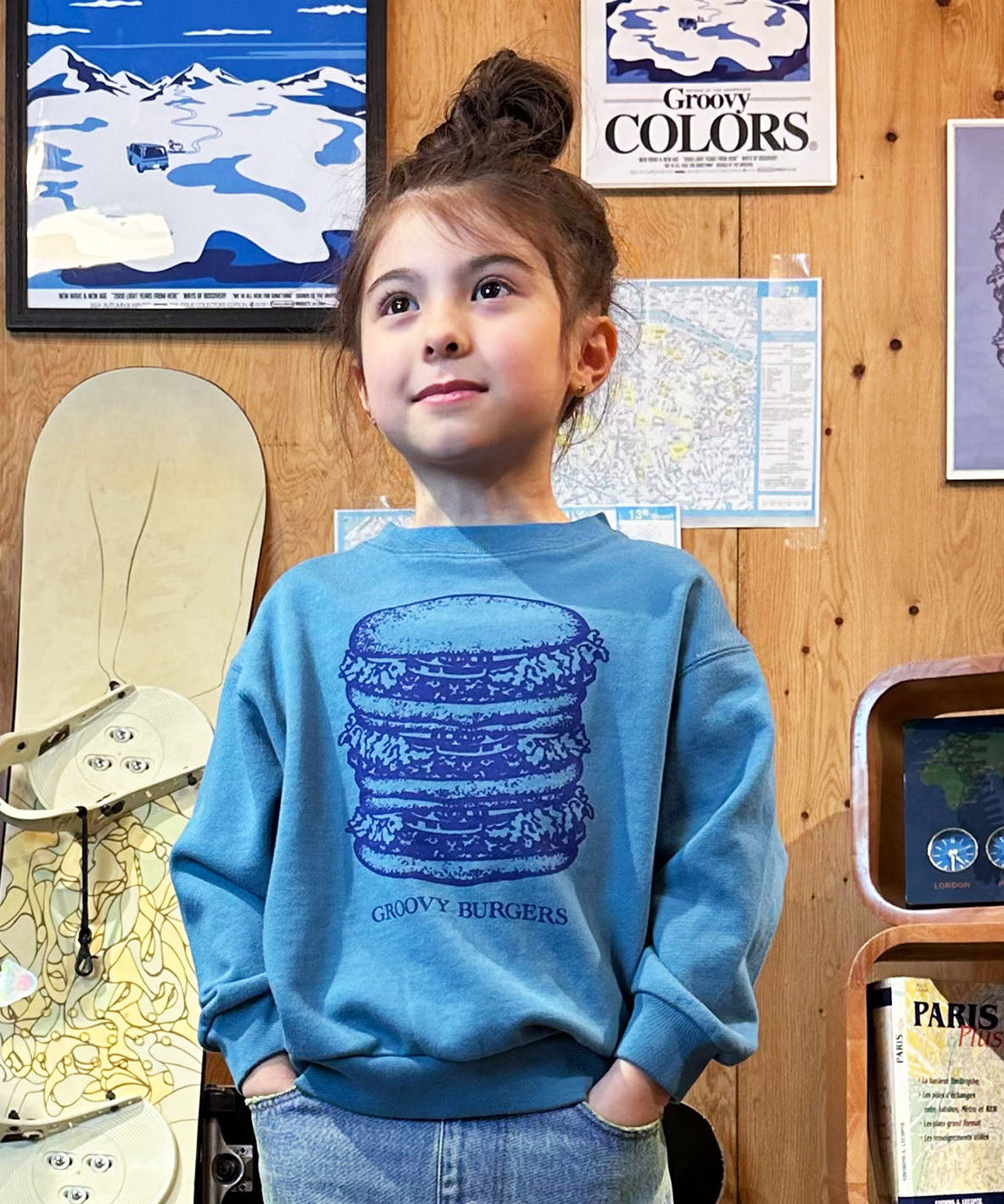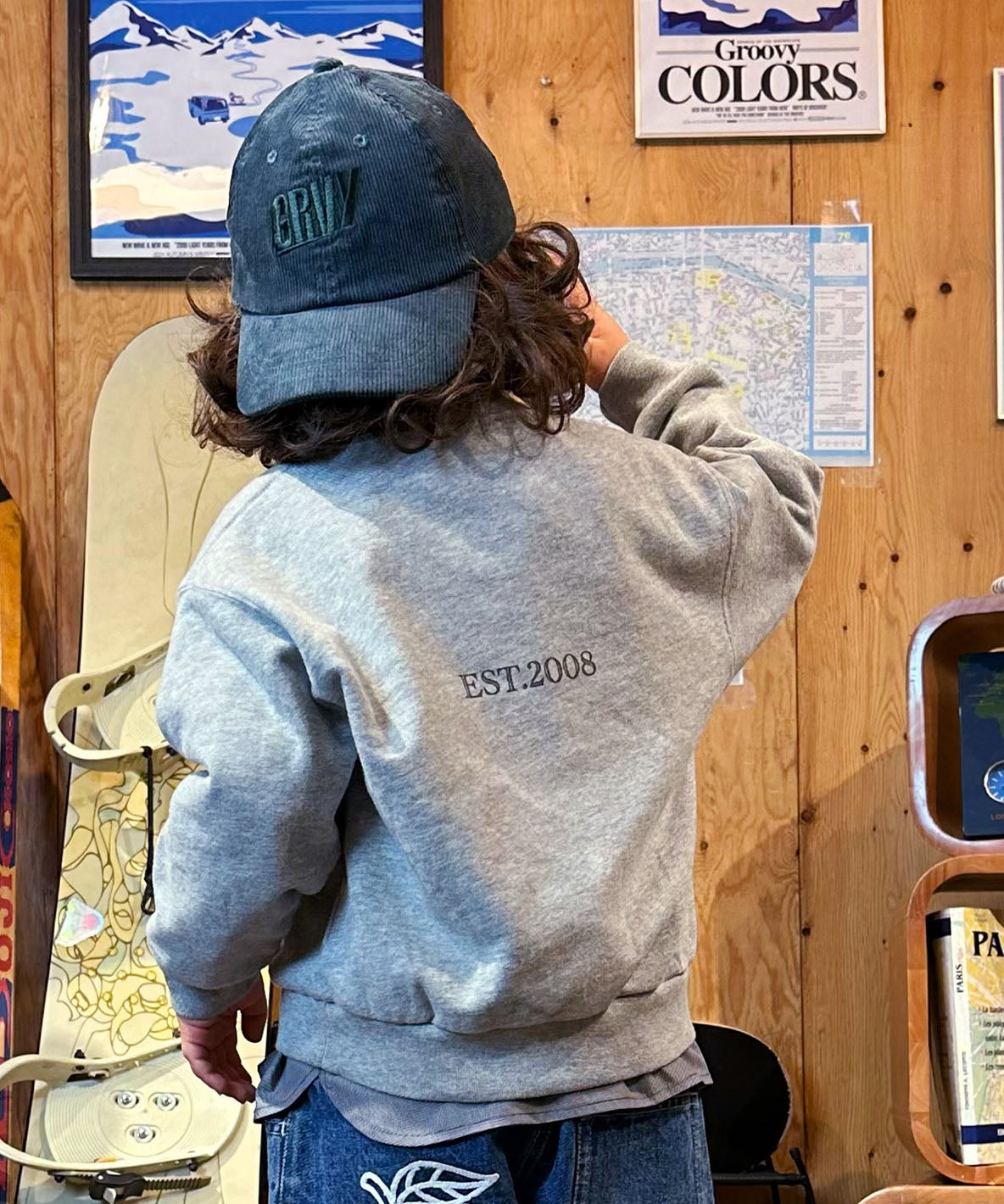 定番の全体的に少しゆとりのあるシルエットの裏毛素材のクルーネックスウェット。昔の偉大な音楽家をモチーフにしたヴィンテージスウェット風に仕上げたGROOVYらしいハンバーガーのグラフィック。シンプルながらも一癖ある着やすいスウェットで、バックプリントはブランドがスタートした年の2008をプリント。