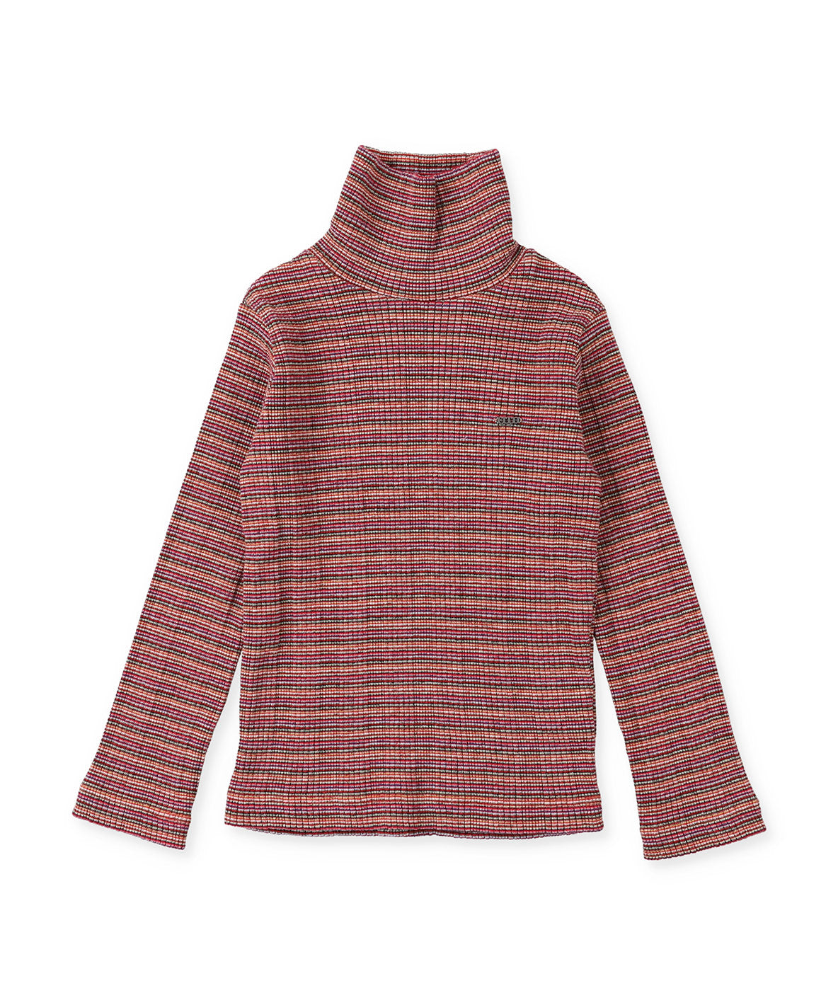 テレコの畝がランダムに針抜きになった、和歌山県産・日本製のマルチボーダー素材です。とても贅沢な色使いで、白・赤・茶・黄緑・紺・ピンク・水色・緑・黄の9色を使用した、秋冬のコーディネートにマッチする、他にはない華やかなカラーとなっています。ストレッチの効いたコットン生地が締め付けのないフィット感で、いつでも心地良い着用感を与えてくれます。スッキリとしたシルエットは、1枚でメインとしてもインナーとしても大活躍な、ハイネックTシャツです。