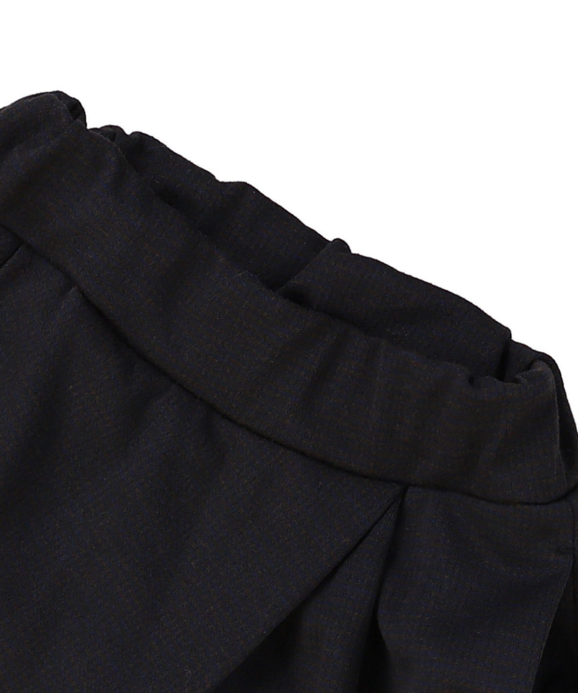 ウールジャージをポリエステルで表現したウール調合繊素材です。 起毛させることで温かみがあり、ウールの洗えないと言うデメリットを解消した、シワになりにくいイージーケア素材です。 仮撚加工という、糸に一旦撚りを掛けたうえで熱を加え、その撚りを戻す工程を連続で行うことで、ふんわりとした風合いや弾力性、伸縮性が生まれる糸にすることができ、その糸を使用して一手間をかけた素材です。 フロントの斜めに入った大きめタックがポイントになった、アシンメトリーなデザインです。 総ゴム仕様で小さなお子様も動きやすく着脱も簡単です。 カットソー素材のため、柔らかく履きやすいリラックス感もありながら、ウール布帛素材の様な見え感がオススメです。