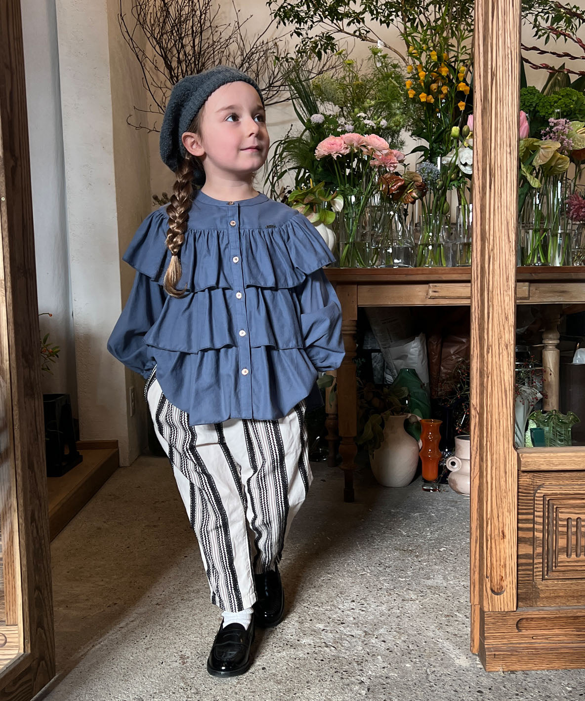 薄手で軽く、ソフトな風合いの着心地よい素材に仕上げました。ギャザーをふんだんに取った3段のティアードブラウスです。