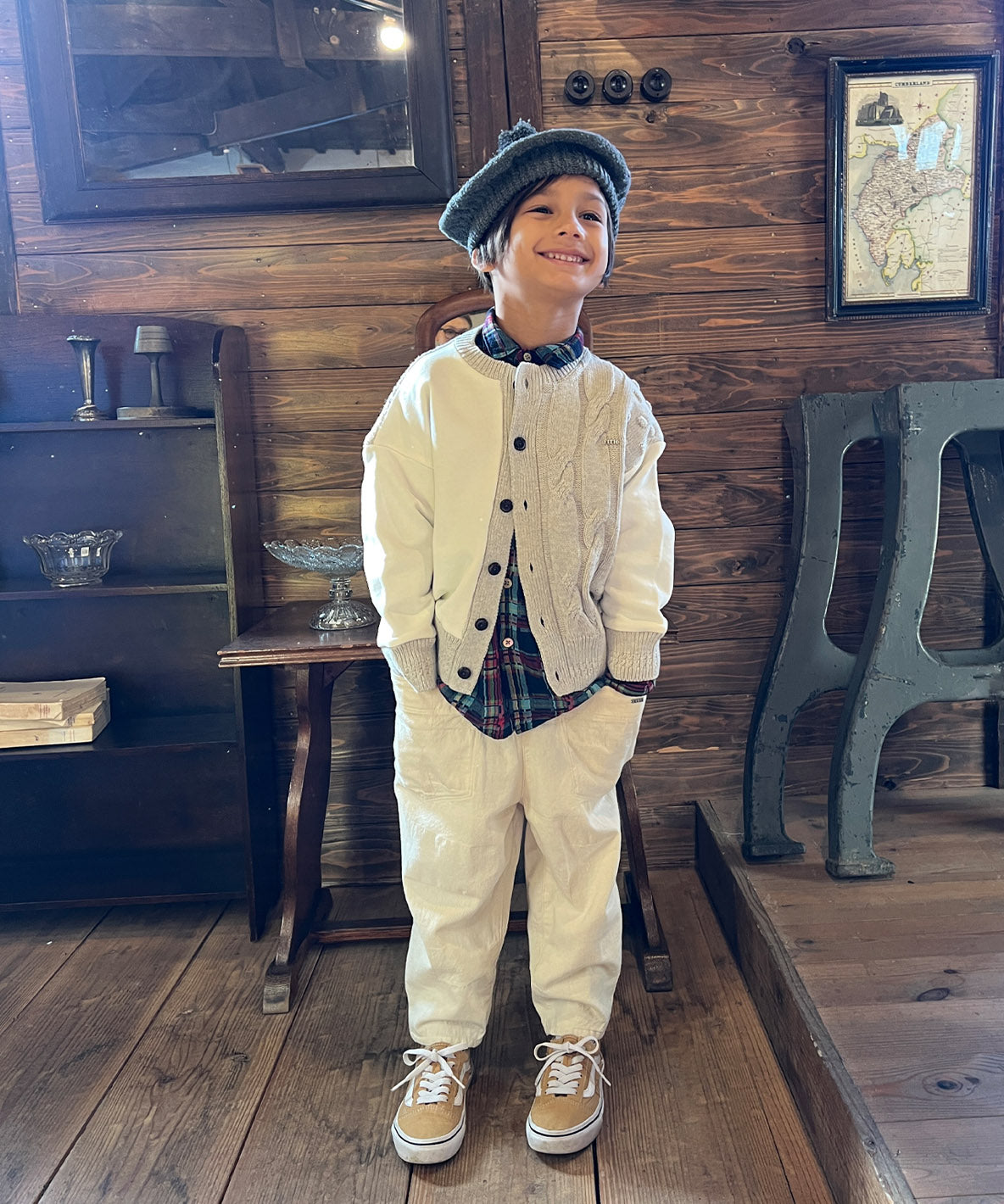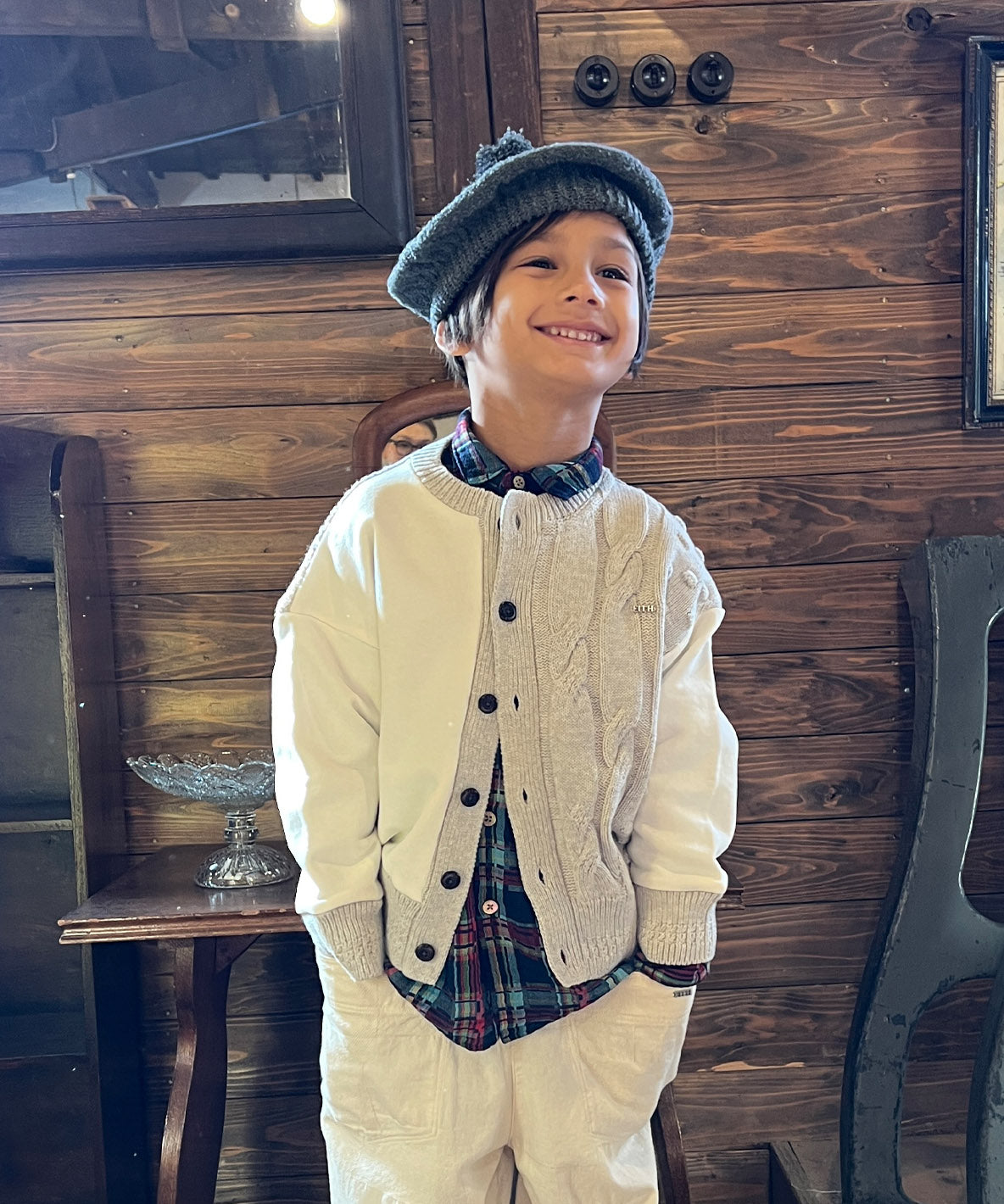 ニット×裏毛のドッキング。ニット、裏毛共にコットン100%で着心地も良しです。存在感抜群の縄編み・畔編み・ドット柄の3柄と裏毛を組み合わせた丸首カーディガンです。ゆったりシルエットの軽く羽織れる万能アイテムです。