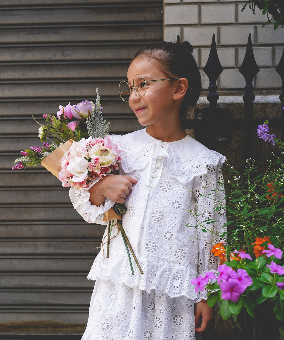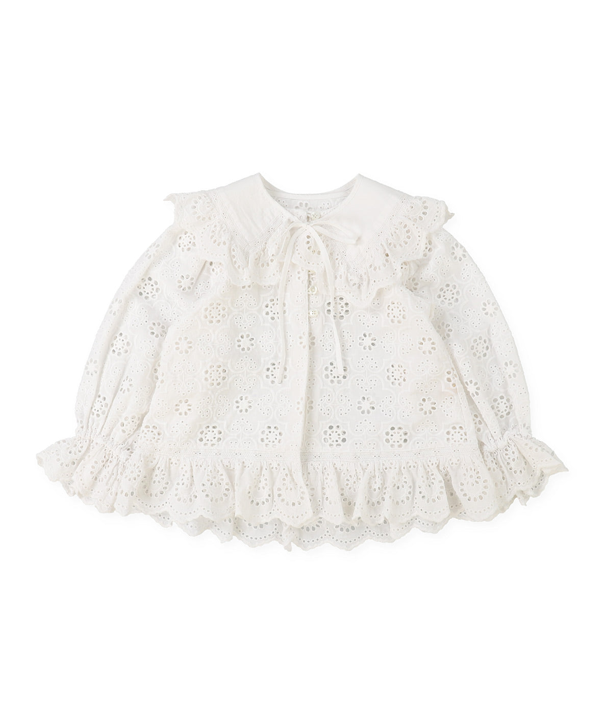 コットン地にアイレット刺繍を施した、カットワークレースが目を惹くブラウスです。裾、袖口、付け衿にもレースを贅沢に使いました。スッキリとしたシルエットでパンツスタイル・スカートスタイル・デニムにも合わせやすく、付け襟を外してシンプルにも着ていただけるコーディネートの主役になるブラウスです。オケージョン対応のワンピースと合わせて着ていただくこともできます。