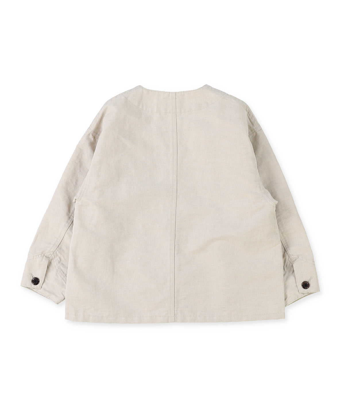 ゆったりシルエットのノーカラージャケットです。12620608綿麻高密度ウェザー6分丈パンツと同素材で作っておりセットアップで着ていただけます。12620701、12620802とも同素材です。セットアップが可能です。