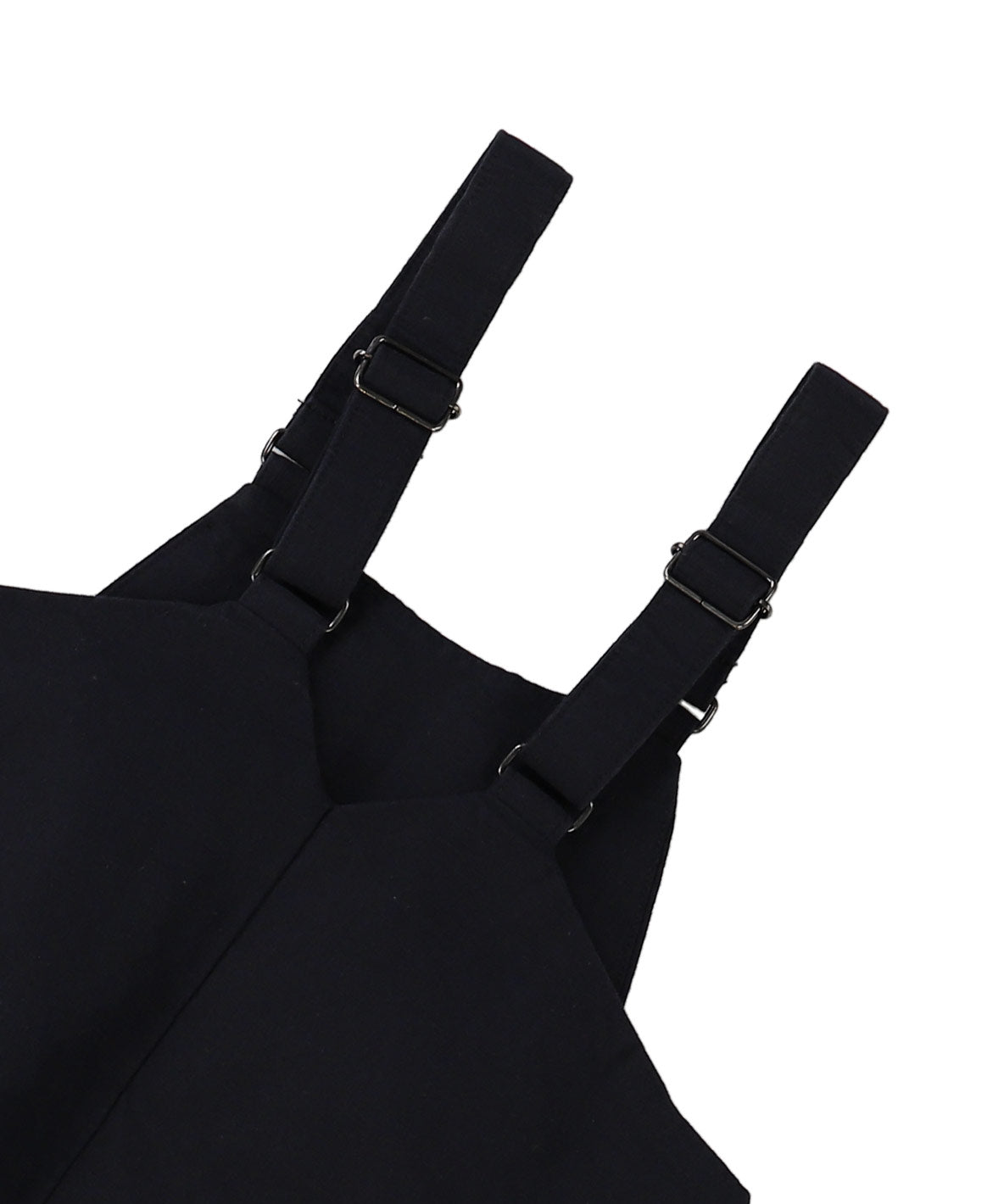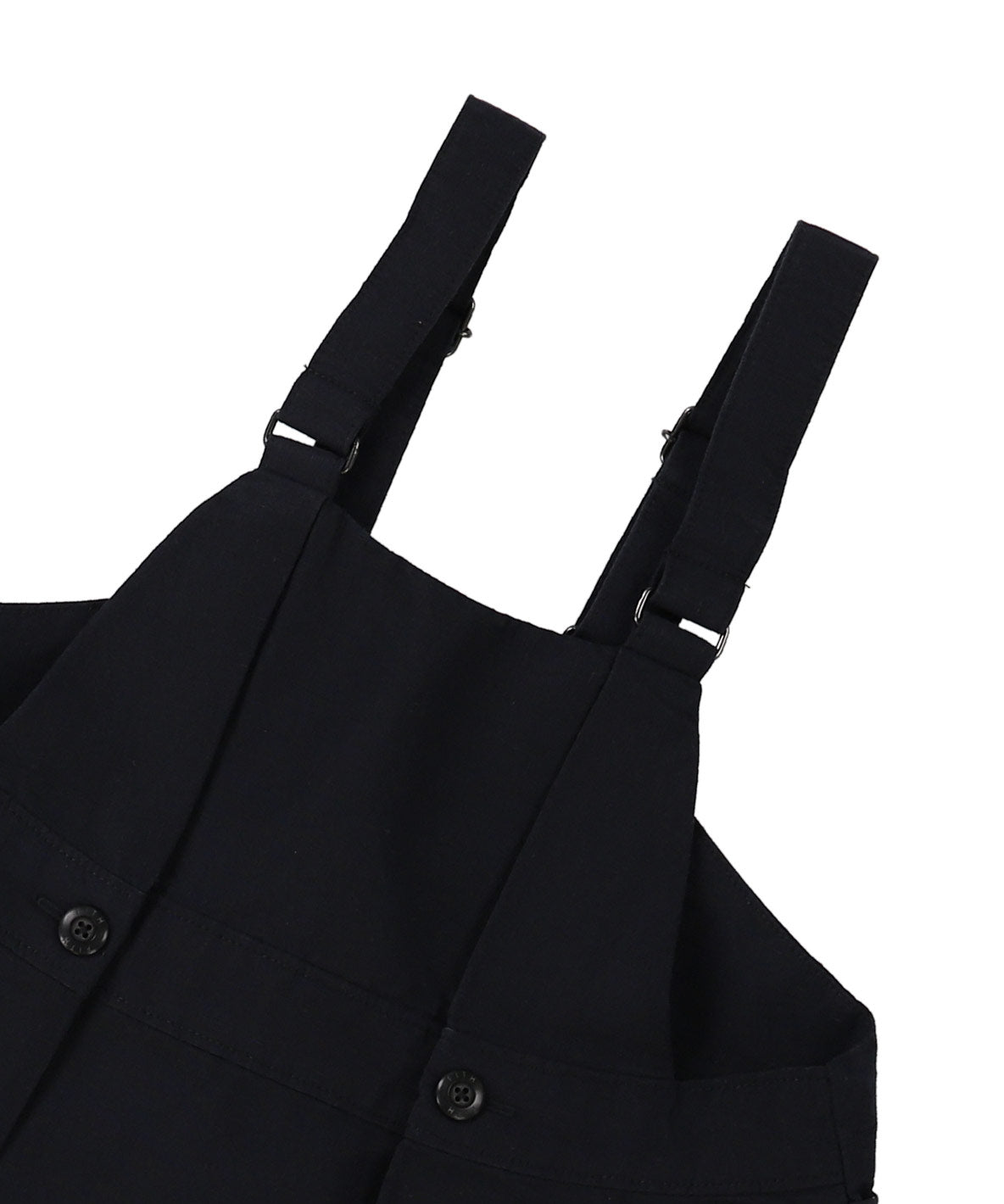 フロントのタックと釦がアクセントになったAラインのサロペットスカートです。12620204綿麻高密度ウェザージャケットと同素材で作っておりセットアップで着ていただけます。