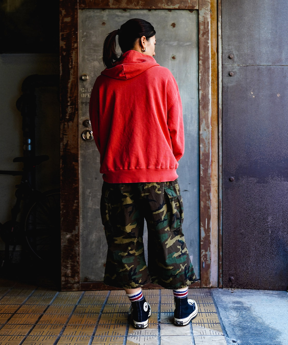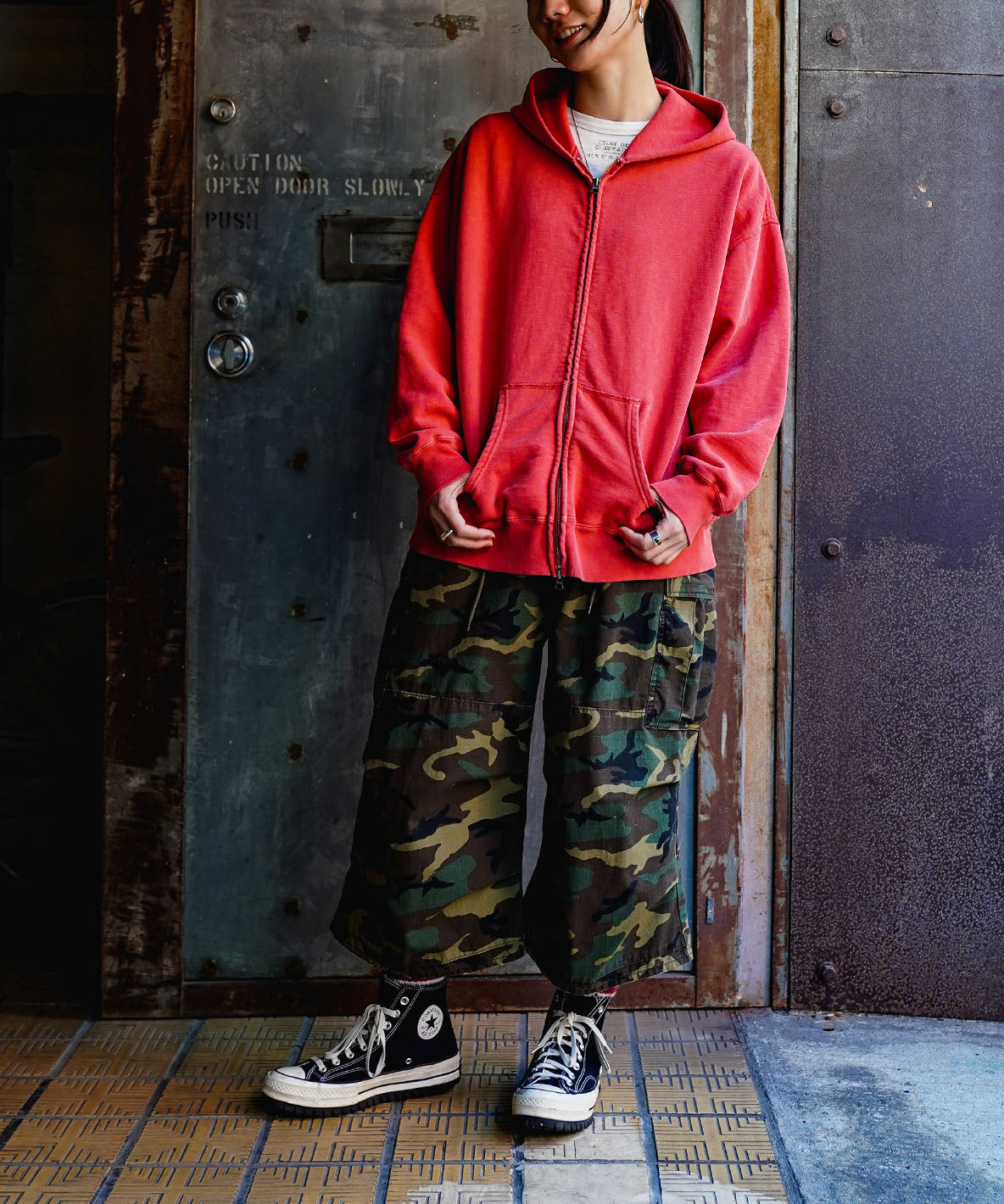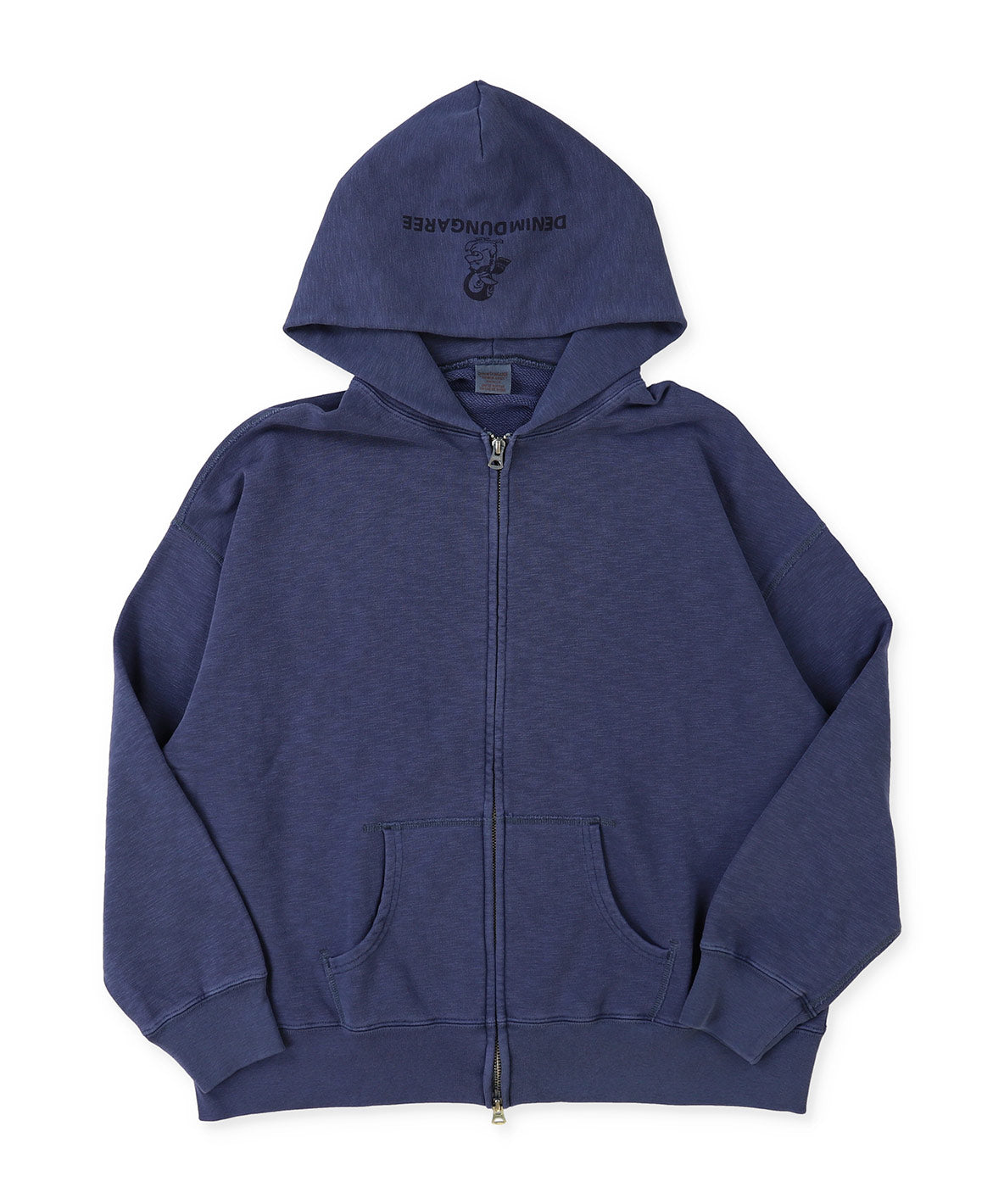 フードの裏にファーストペンギンがちょこんといるジップパーカー。もちろん下ろしてもいいですが、被ると前からもペンギンが見えて、コーディネートのアクセントになります。