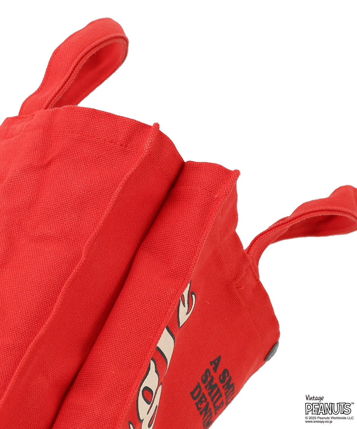 鮮やかなカラーが目を引くトートバッグ。フロントには スヌーピーと ウッドストックの仲良しコンビが描かれ、見ているだけで気分も明るくなるデザインです。「A SMILE SHARED IS A SMILE DOUBLED(分かち合った笑顔は2倍になる)」というメッセージ入りで、サイドには「giggle」の文字も。スナップボタン付きで中身が見えにくく、おでかけやサブバッグにぴったりなサイズ感です。デイリー使いにおすすめです。