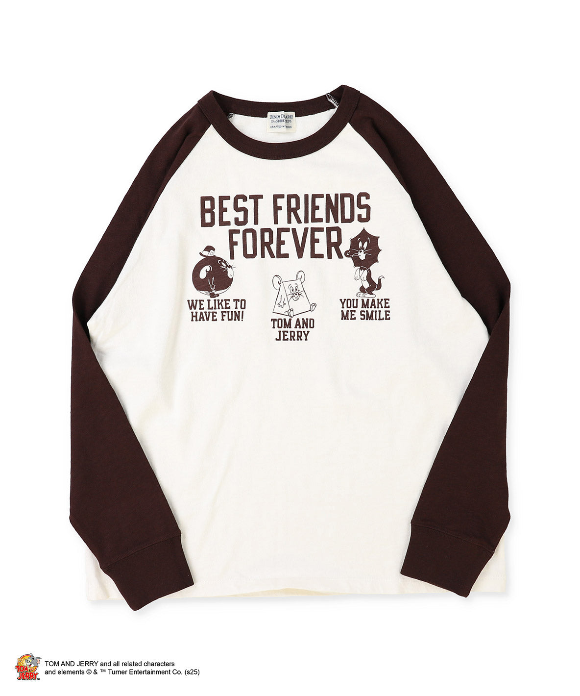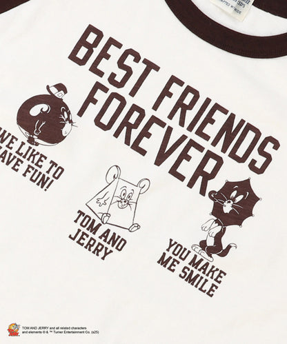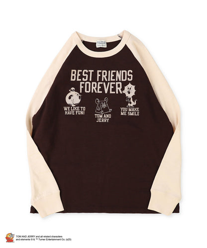 ネコのトム、ネズミのジェリーとタフィーがアニメのドタバタシーンでユーモアたっぷりに描かれたフォルムをプリントしたラグランスリーブのTシャツです。BEST FRIEND FOREVERは、DDもTOM and JERRYでもフレンドシップに共通する合言葉です。
