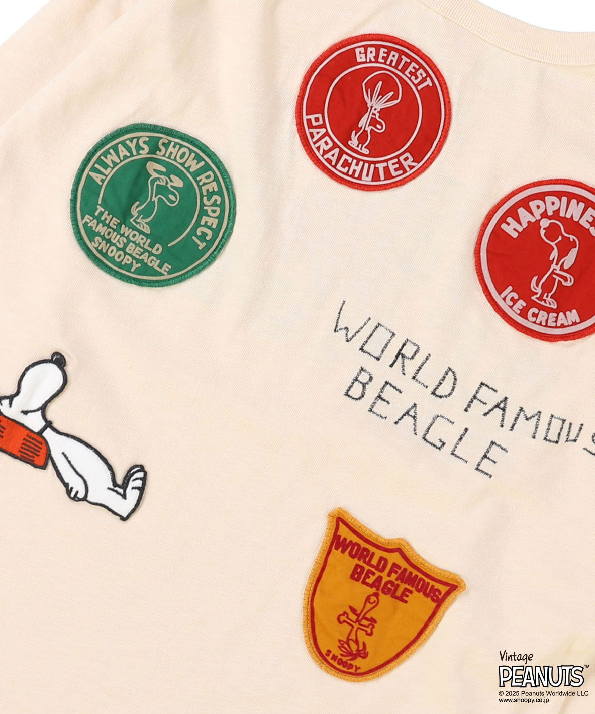 後ろに5つのワッペンがインパクト大のスヌーピーTシャツ。前の文字は一文字ずつ付ける位置をずらし(コンピューターで打ち出した文字は使わず)着た時に自然に馴染むように作っています。 手作り感があり時代を超えて愛される一着に仕上げています。