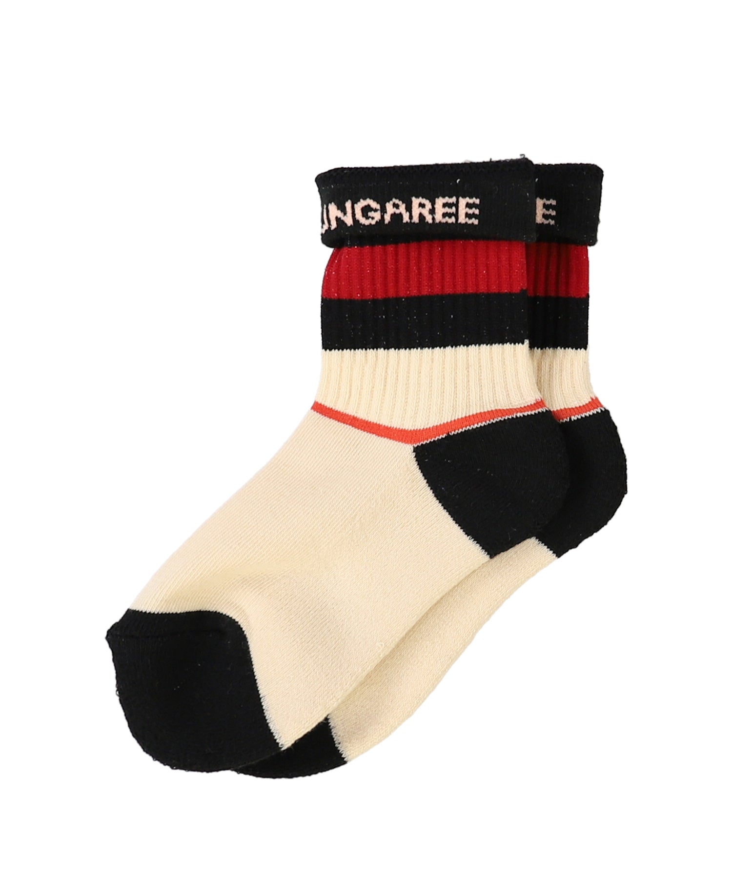 クラシックなボーダーデザインに、ブランドらしい遊び心をプラスしたソックス。ブラックをベースに、レッドとアイボリーのラインが映え、落ち着きの中にも存在感のある足元を演出します。履き口にはDENIM DUNGAREEのロゴをあしらい、さりげないアクセントに。程よい厚みと伸縮性のある編み立てで、足にやさしくフィットします。つま先とかかとの配色切り替えにより、耐久性とデザイン性を両立。デイリーコーディネートに取り入れやすく、スニーカーやローファーとも好相性。シーズンを問わず活躍する、使い勝手の良い一足です。