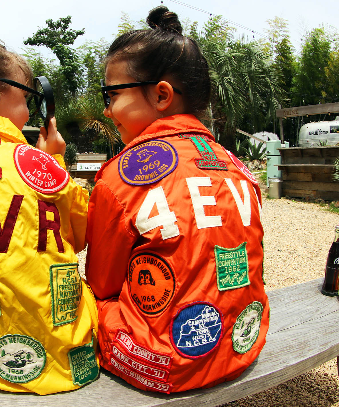 愛犬チームのコーチジャケット。後一杯に愛犬と参加したワッペンを持ち主が思い出として付けた設定存在感抜群なので迷子にならないです。