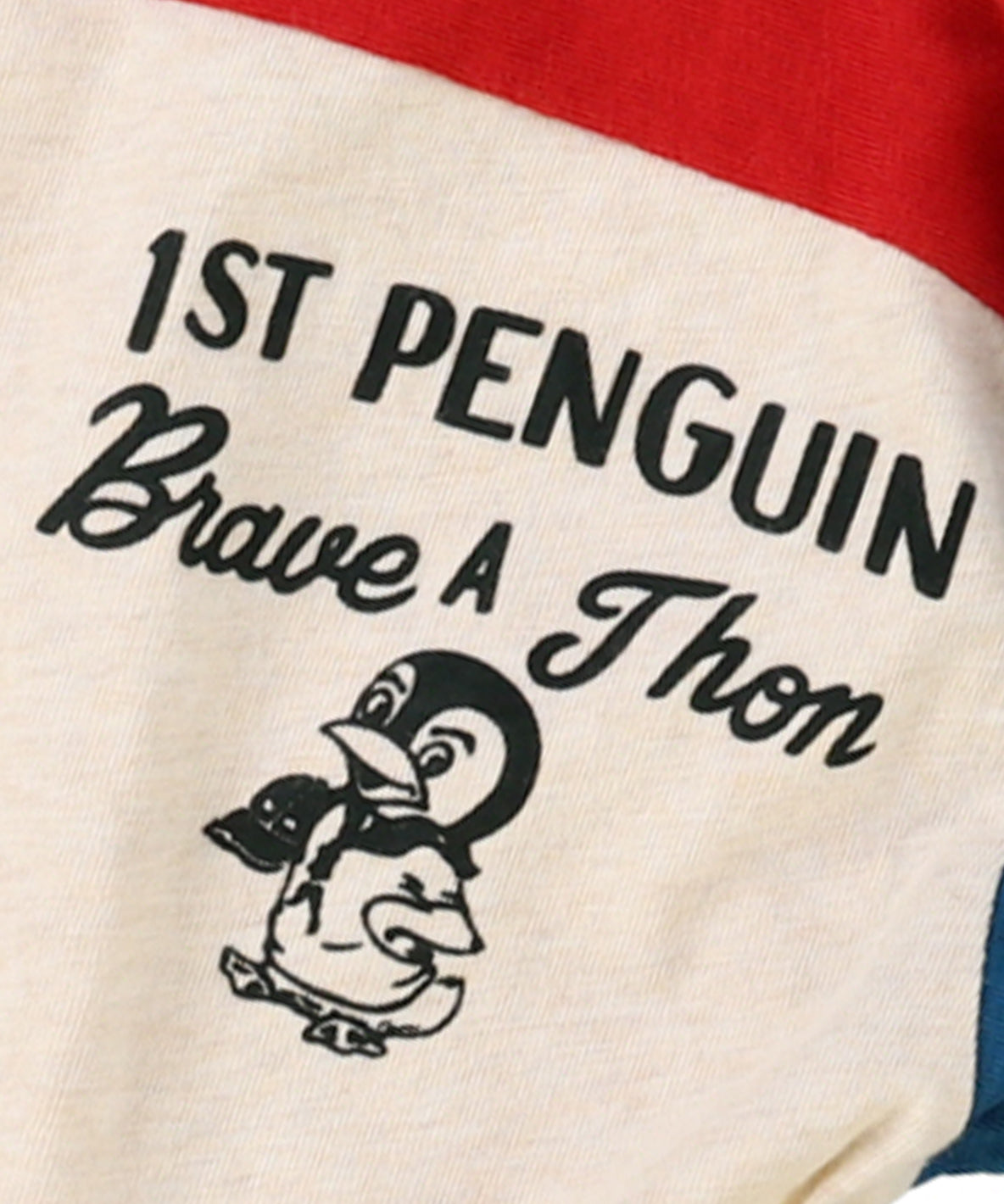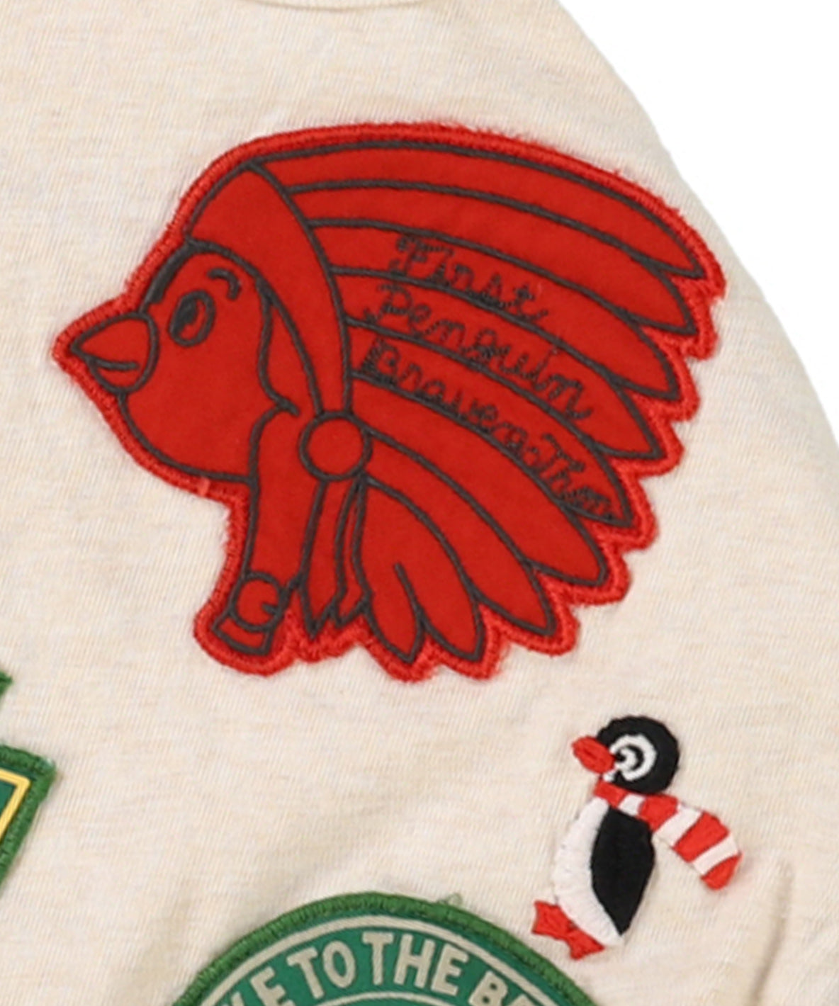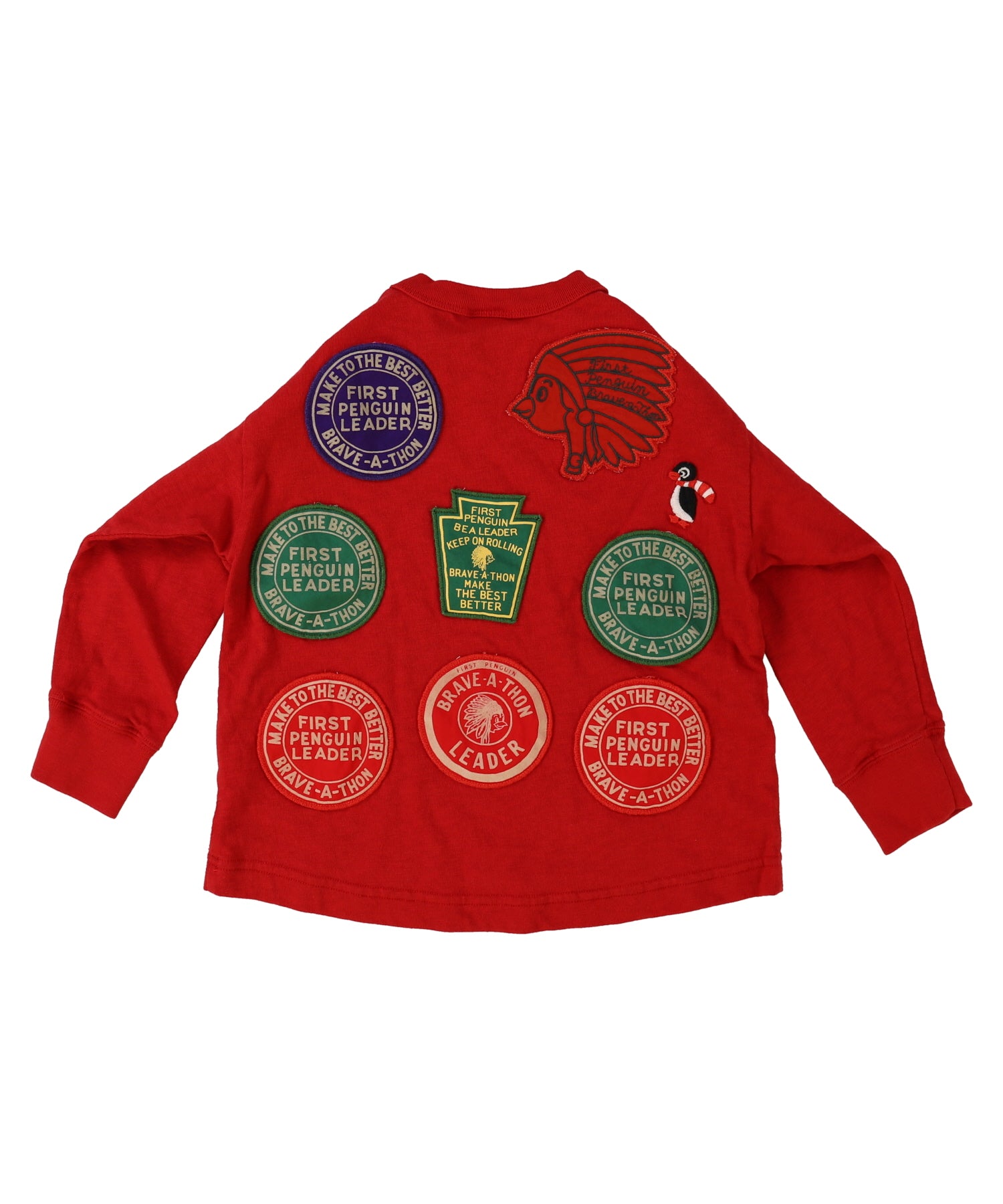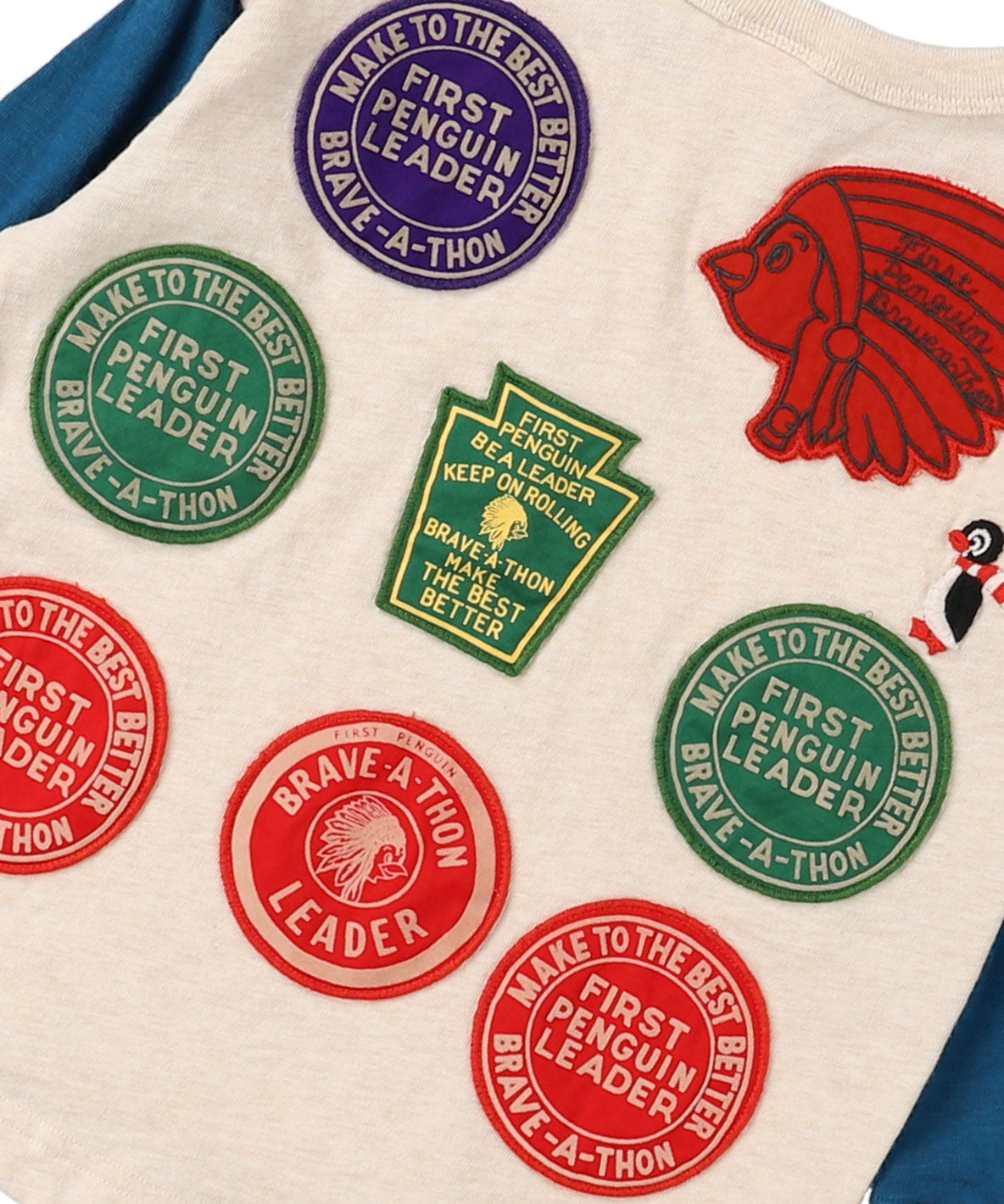 自ら先頭に立って困難に立ち向かって欲しいというメッセージTシャツ。真ん中の愛嬌あるペンギン(眉毛がミソです)が人気です。後の9つのワッペンが存在感抜群です。
