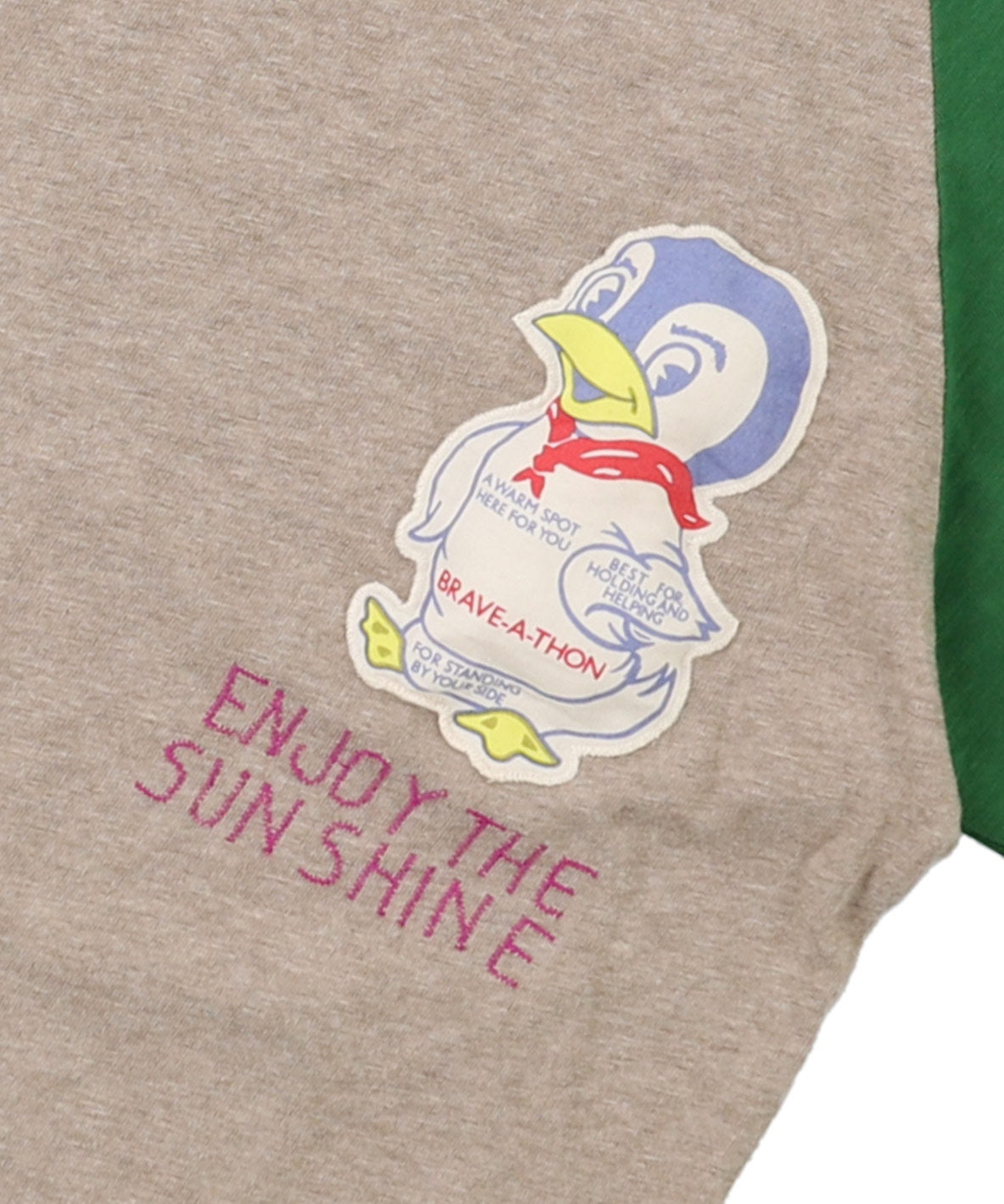 左脇についた綿入りのアップリケが存在感抜群のラグランT。カラフルな刺繍が可愛いです。
