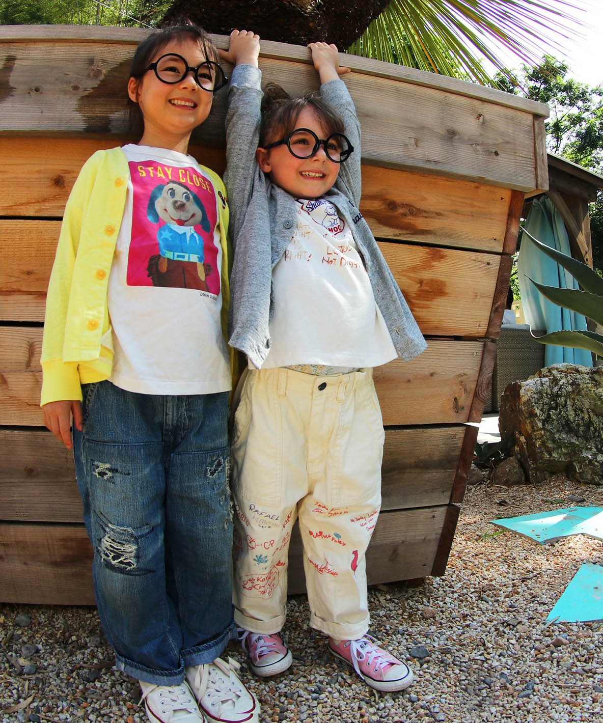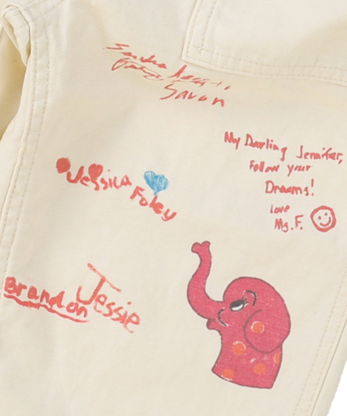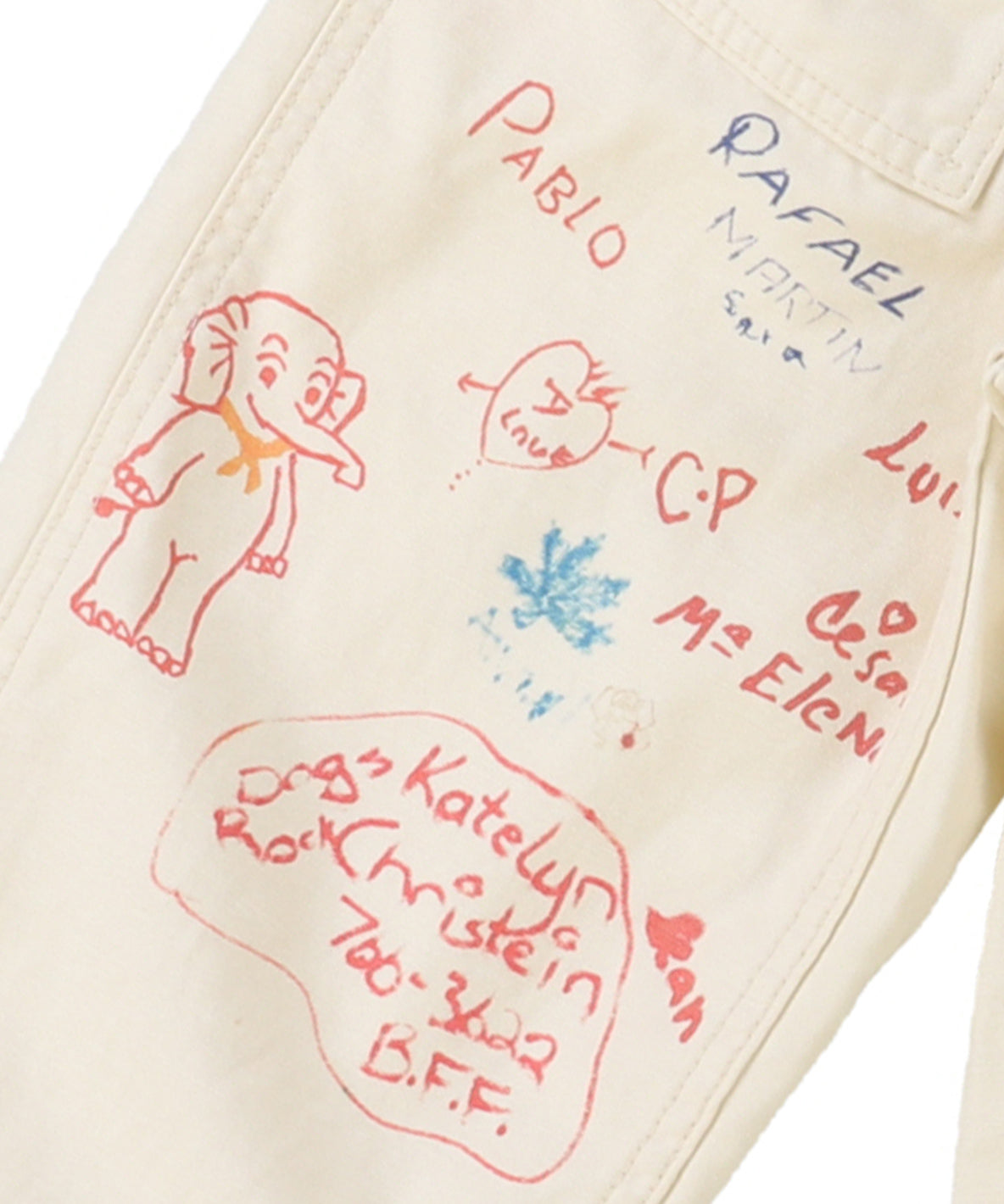 前後に大きめなポケットがついていてひっかりの少ないバックサテンを使用したベーカーパンツ。前にカラフルな落書き(ピンクの象)が存在感抜群で履きやすくコーディネートもし易く万能選手です。