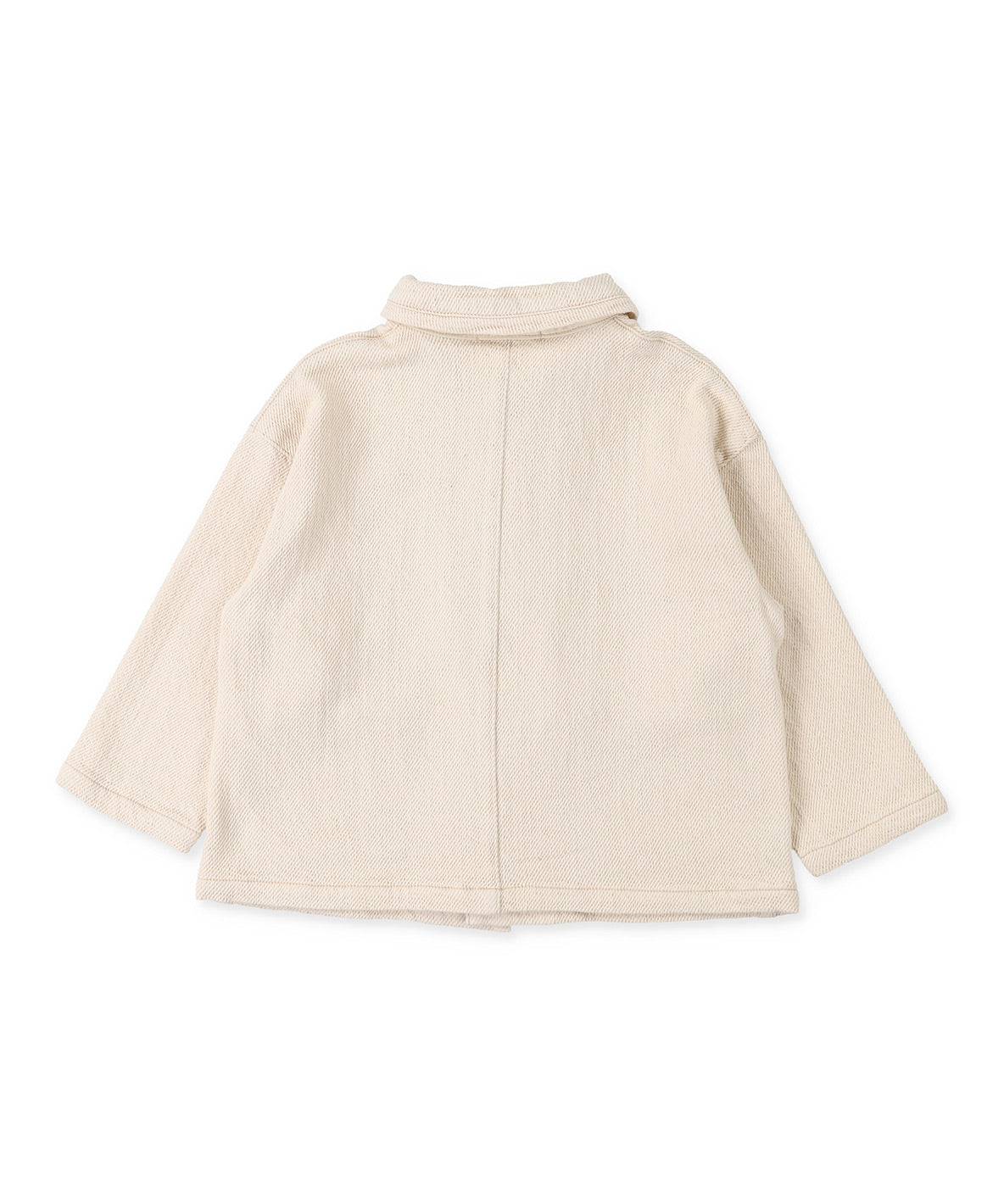 タテ糸に8番手のスラブ糸、ヨコ糸に10番を使用し畝高になるよう組織を考えて織られた綿の綾織物の生地を使用。タテ糸を表に、ヨコ糸を裏面に多く出す組織にすることにより特徴的な綾目、かつ非常に柔らかい風合いが特徴のジャケット。また、洗い込むことで表面の表情が変化し、経年変化(インディゴ)も楽しめる素材。マリンカラーでゆったりとしたシルエットのジャケット。