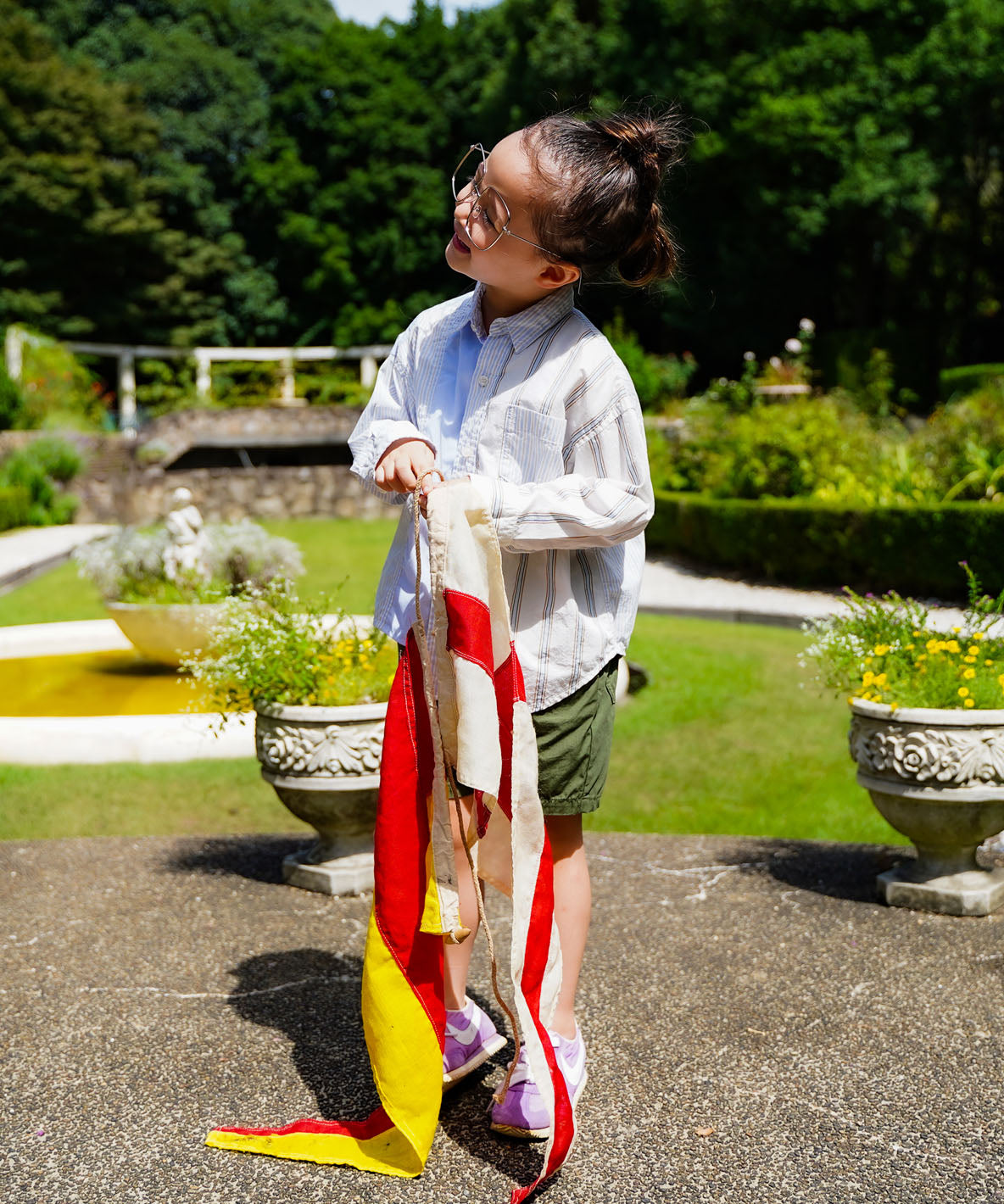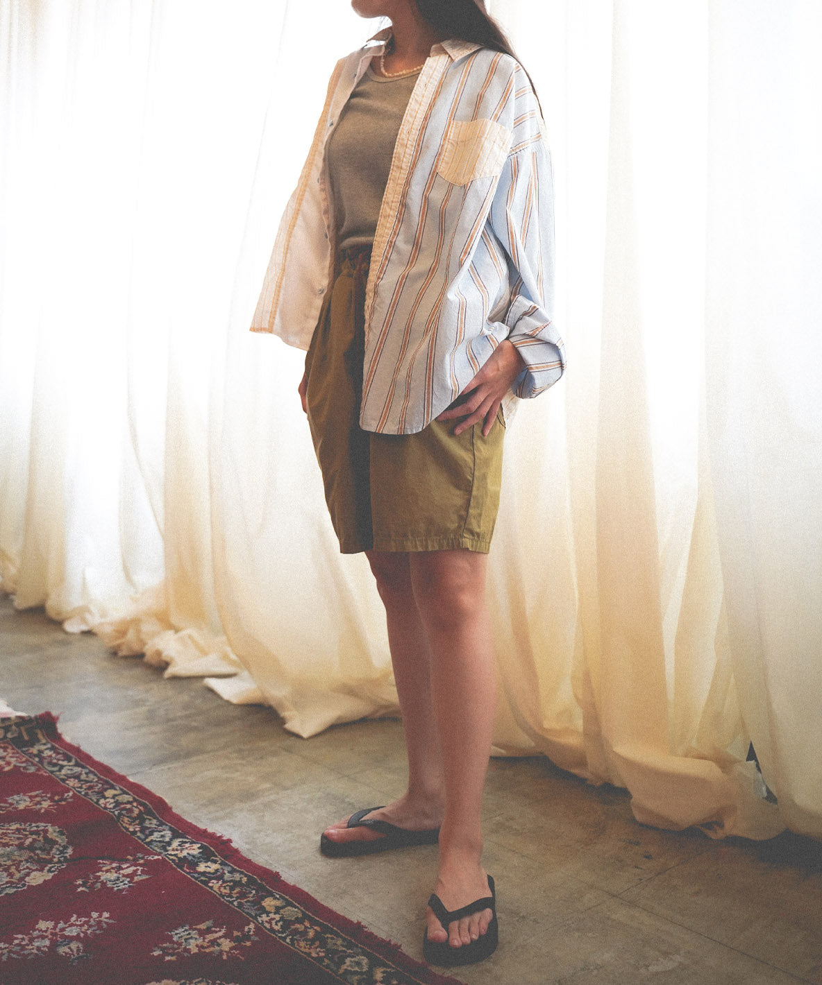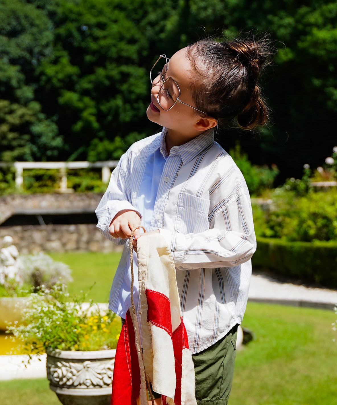サイズアウトしてもう着れなくなった自分のシャツに、パパのYシャツやママのブラウスを組み合わせてリメイクした設定のシャツ。アシンメトリーなデザインとピッチの違うストライプ使いが目を引く、ユニセックスなオーバーサイズのシャツです。今シーズンはカットソーやパーカーにシャツをレイヤードして緩く着崩すのが気分。