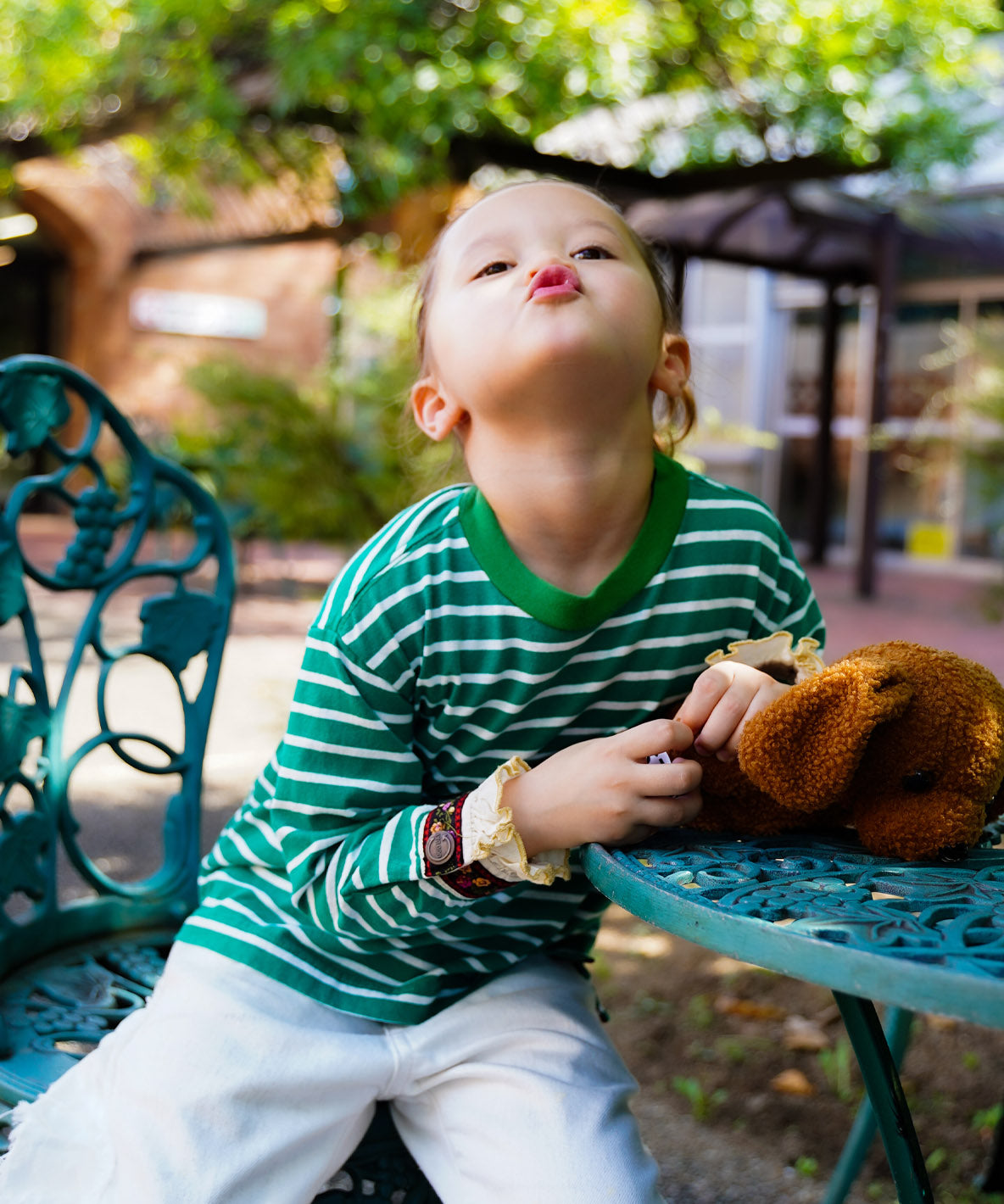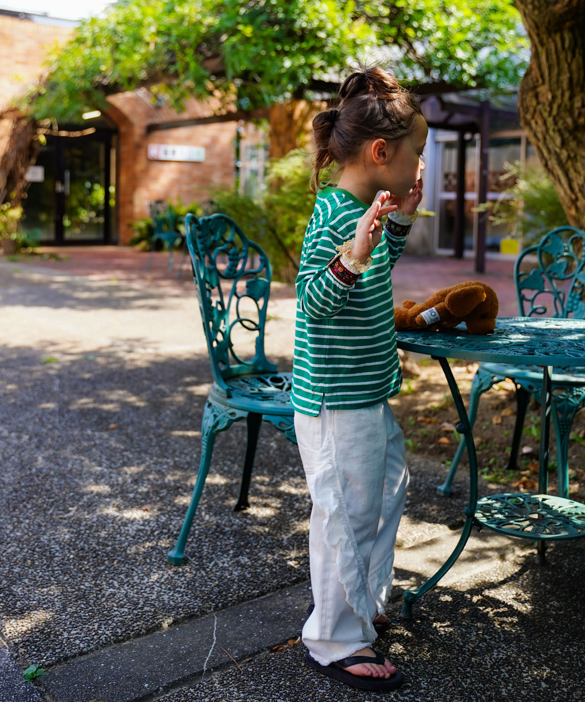 GTH定番の、程よい肉感でサラッとした肌触りのボーダーTEE。今シーズンのテーマフロストバーデンの夏至祭で皆んなが着てるブラウスをレイヤードしたイメージで、ボーダーカットソーの袖口にチロリアンテープをあしらった、フリルのカフスをドッキングしました。シンプルなボーダーTEEがワンポイントで一気にロマンチックに変身。シンプルながら1枚で存在感のあるボーダーTに仕上げました。