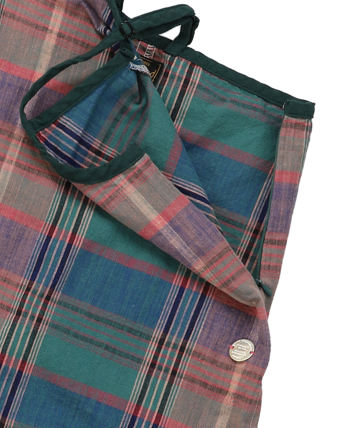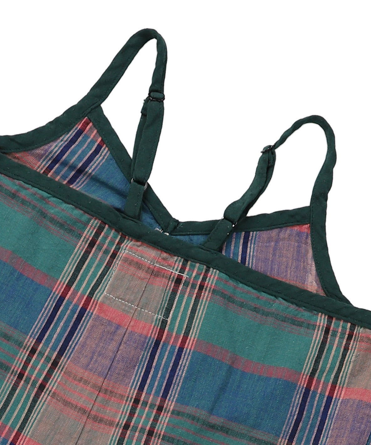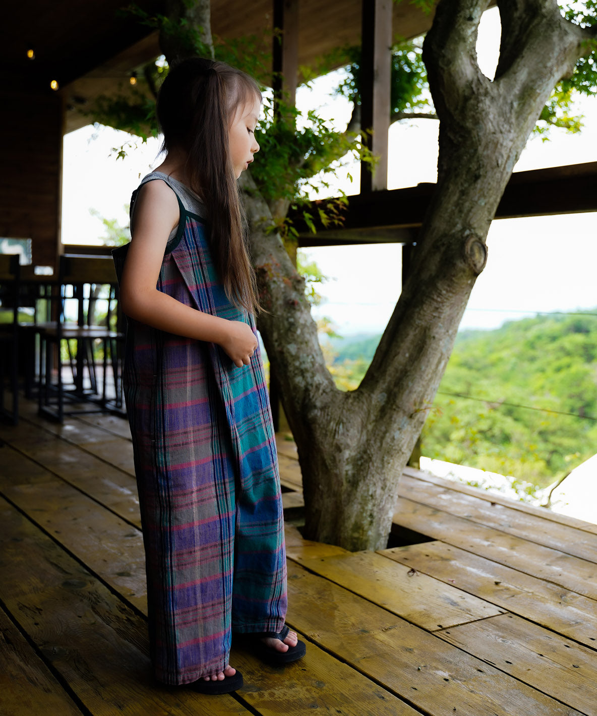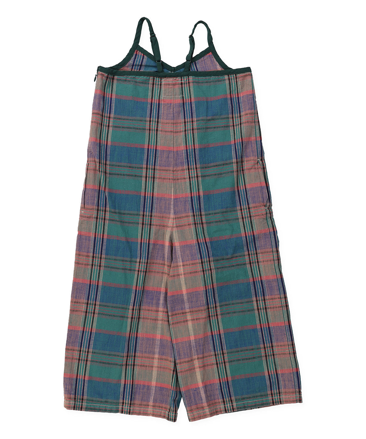 GTHオリジナル、夏の終わりの夕暮れどきの海辺のようなイメージの、平織りによる多色織のマドラスチェック。 ゆったりとしたサイズ感の変形のオールインワンで、晩夏にぴったりなちょっと落ち着いた色合いのマドラスチェックなので肌を露出してもヘルシーに着ていただけます。