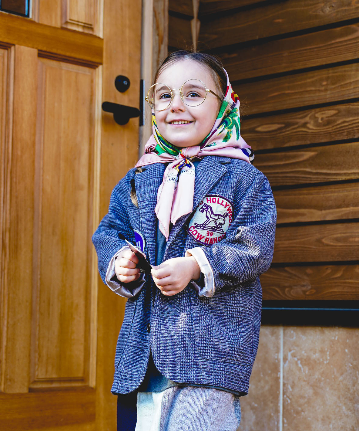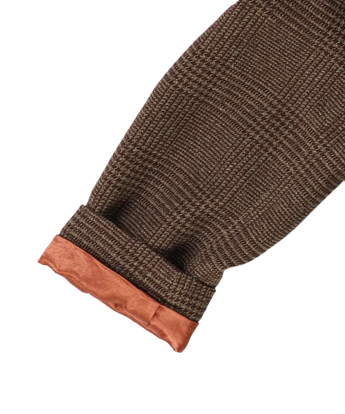 肩が落ちるくらいのオーバーショルダーのオーバーサイズジャケット。コートのようなジャケットでジャコット。スキージョーリングの大会で着用していたいうストーリーのワッペン(右胸の馬がスキーをしているワッペン)がついてます。ツイーディーなグレンチェックのノスタルジックな雰囲気が今っぽい。デニムやジャージ。スカート。ドレス。どんなアイテムでも良い具合にハンサムなスタイルが完成します。スキージョーリング:雪や氷の上を馬に引かせて滑るスキー競技。1920年台に冬季オリンピック競技にもなった。