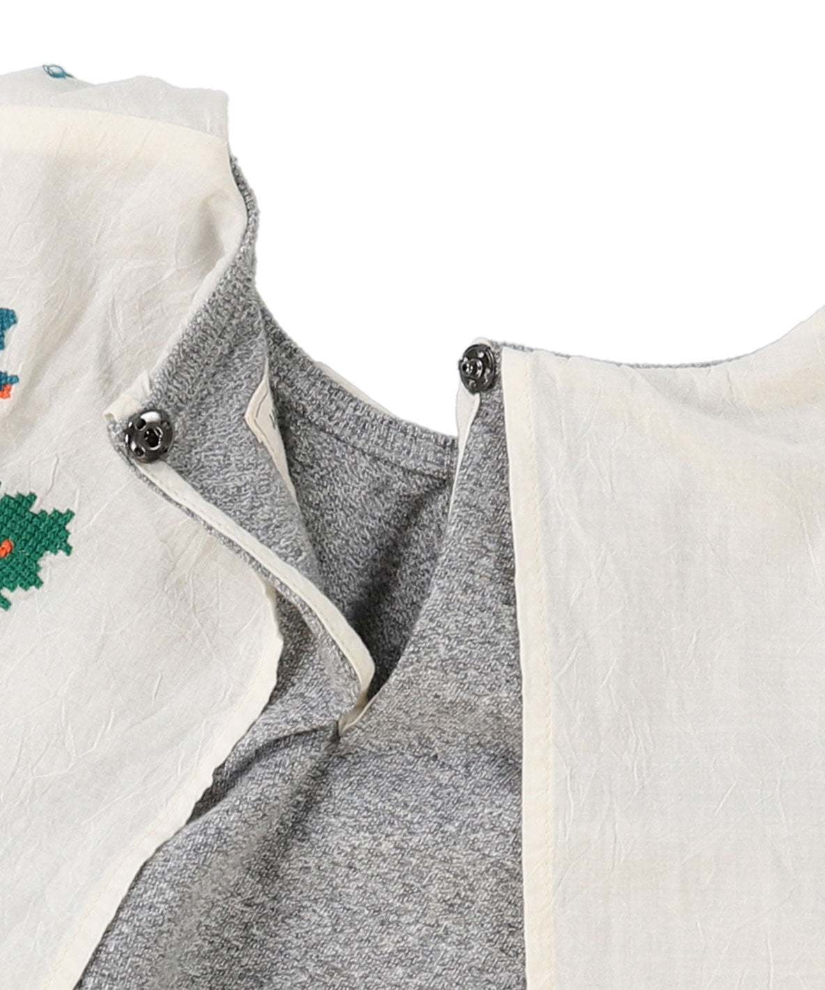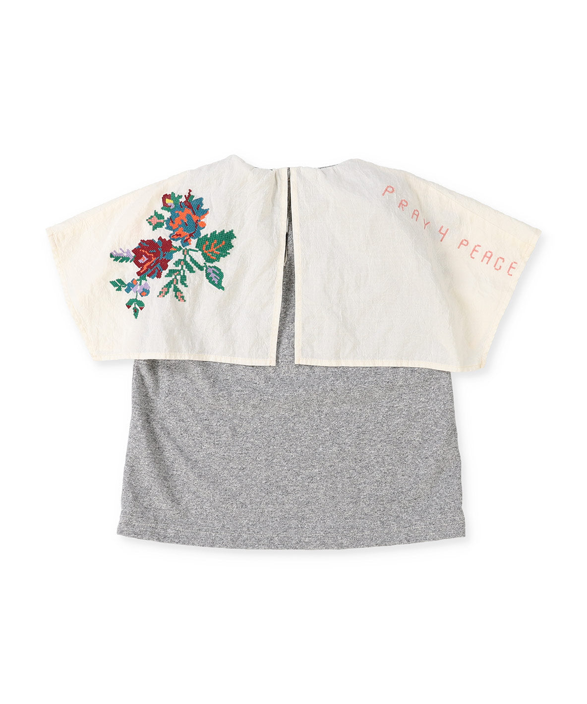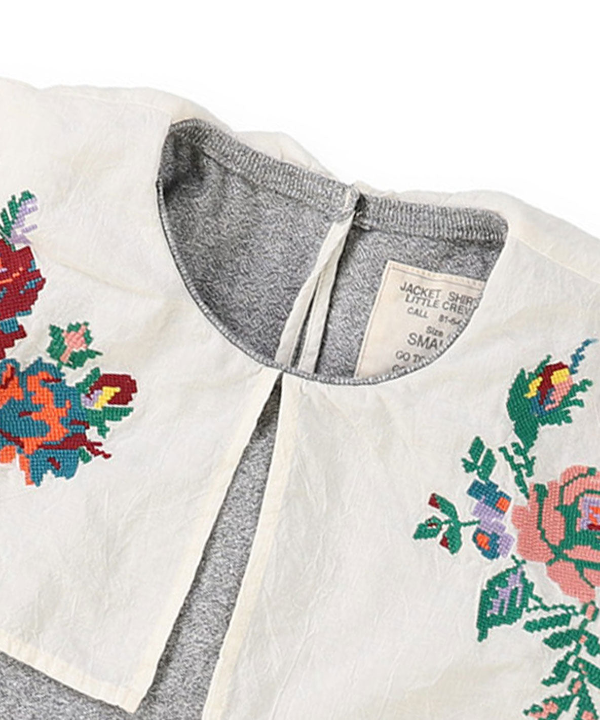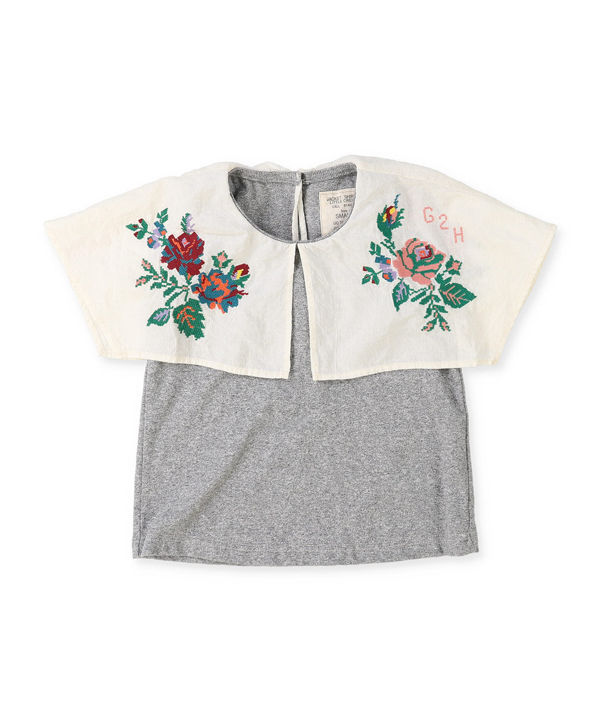 ノースリーブのカットソーに大きめのカラーがドッキングされたトップス。ふと目に入るとちょっとだけ気分が明るくなるクロスステッチのお花たちがアクセントに。気になる二の腕をそっとカバーしてくれるシルエット。気づかいの効いた一枚です。