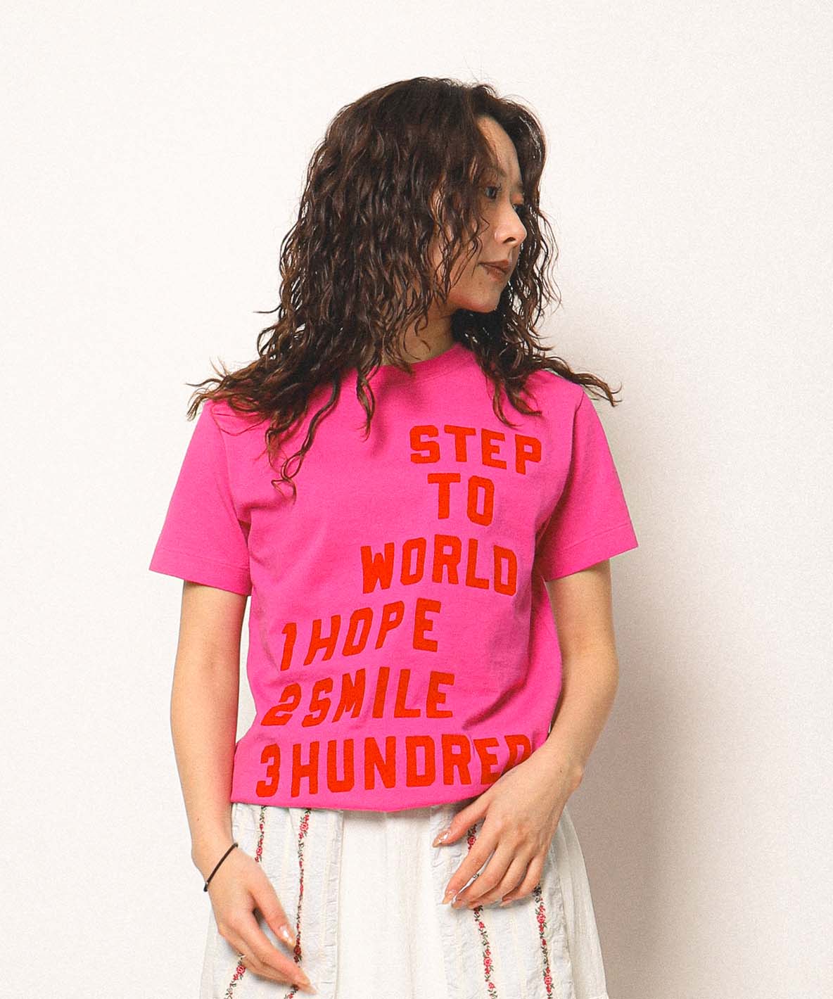 架空のボートクラブのスローガンTシャツ。後ろにはボートを漕いでいるわんこのワッペンが。STEP TO WORLD 1. HOPE —希望を持って一歩ずつ。2. SMILE —笑顔は力に。3. HUNDRED —何度でも挑戦しよう。シンプルだけど、なんか元気が出る合言葉。