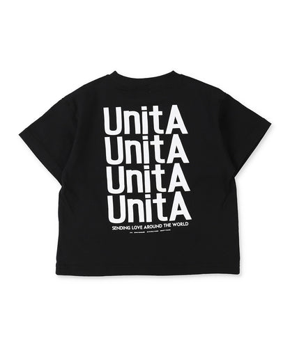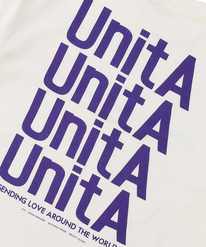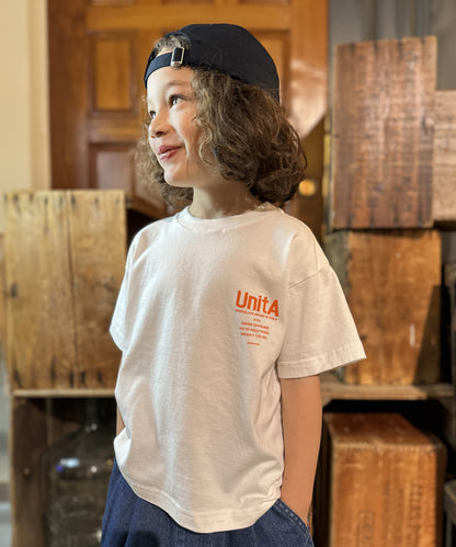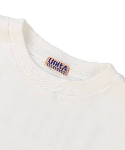 40/2天竺素材の半袖Tシャツ。 ややゆったりとしたシルエット。 左胸にUnitAロゴと4ブランドのロゴプリント。 BACKに4つ並んだUnitAロゴがポイントです。