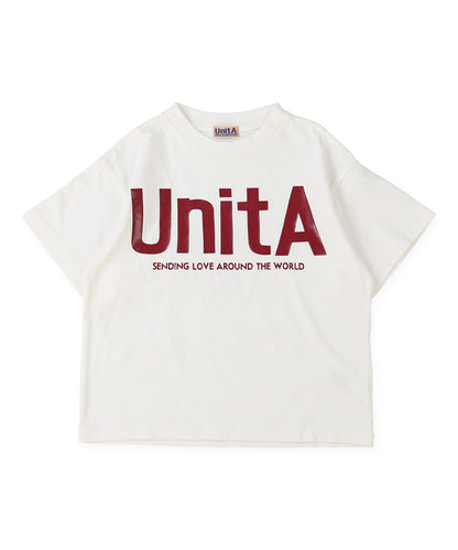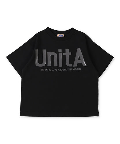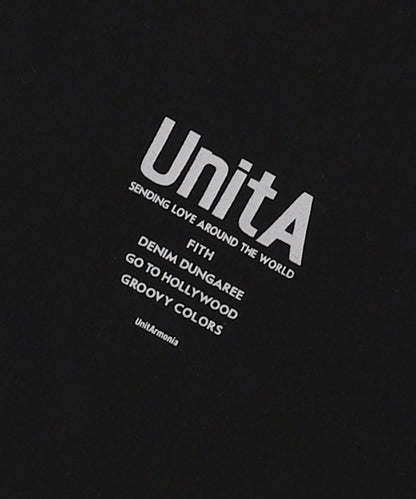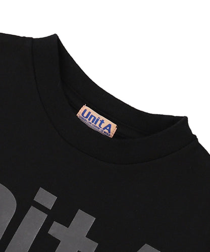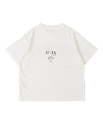 40/2天竺素材の半袖Tシャツ。ややゆったりとしたシルエット。FRONTのUnitAロゴはツヤ感がある光沢ラバープリント。BACKにはUnitAロゴと4ブランドのロゴプリント。