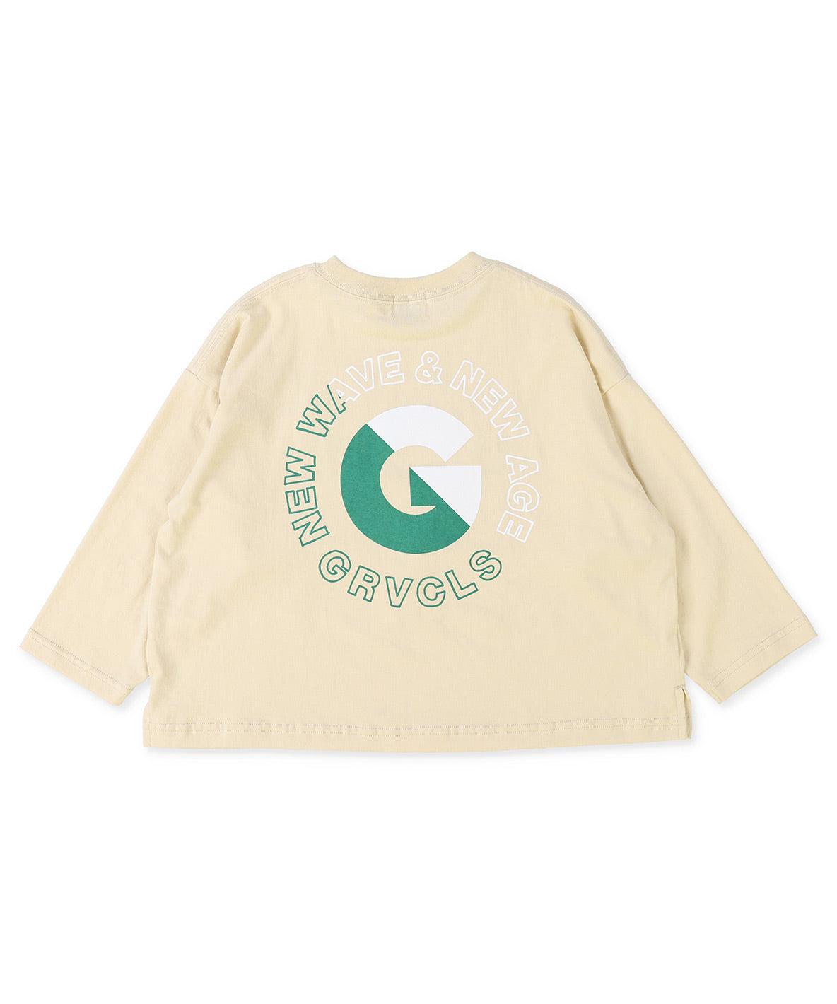 40/2天竺素材のロングスリーブTシャツ。 Tシャツの中で一番身幅が広く、肩落ちする超ワイドシルエット。 両脇裾にスリットあり。 FRONTはサインペンで描いたようなロゴと、GROOVY定番のリンゴモチーフを組み合わせたグラフィック。 BACKは斜めに2トーン配色になった手書きロゴがポイント。