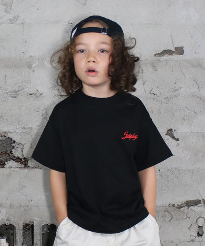 40/2天竺素材の半袖Tシャツ。GROOVY定番型のややゆったりとしたシルエット。 左胸はブランド名を崩して描いたグラフィティ(落書き)ロゴ刺繍。 BACKにはインパクトのあるハンバーガーモチーフをストリートARTのイメージで表現したグラフィック。