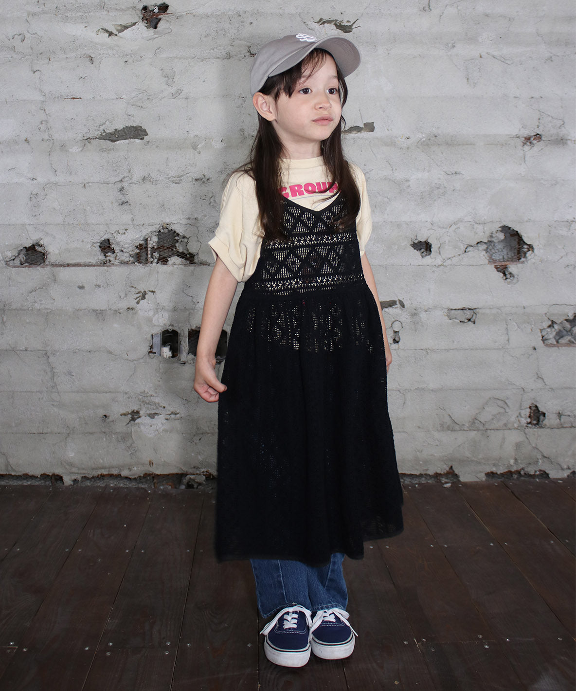 レース生地を使用したキャミソールワンピース。 インナーによって色々な雰囲気の組み合わせを楽しめます。 Tシャツとデニムのボーイッシュなコーデにも相性がよく、この一枚を足すだけで女の子っぽく映えるコーディネートが仕上がります。