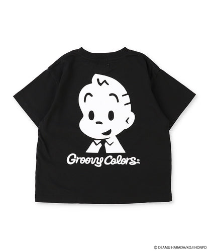 40/2天竺素材の半袖Tシャツ。GROOVY定番型のややゆったりとしたシルエット。左胸にカラフルなJACK・JILL・DOG・CATの刺繍。BACKにはJACKとGROOVY COLORSロゴを組み合わせたオリジナルグラフィックをプリント。