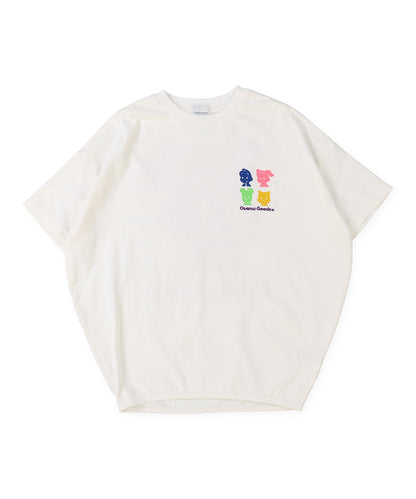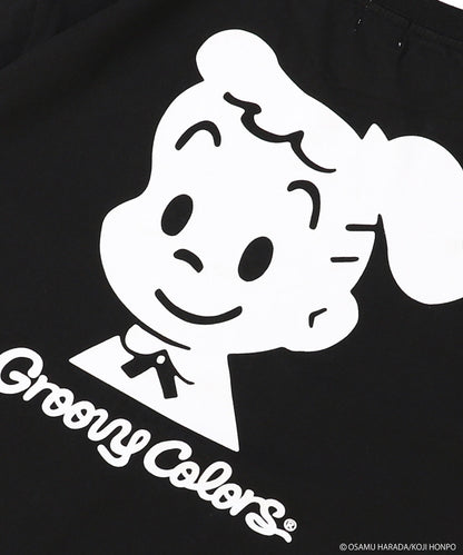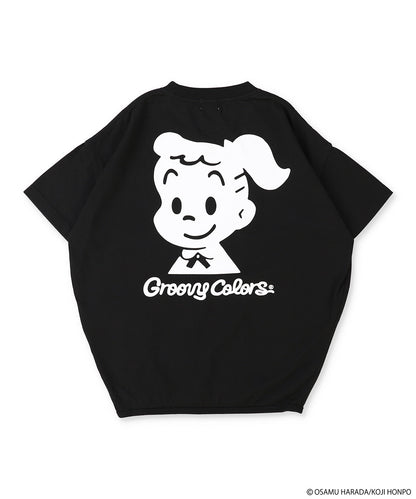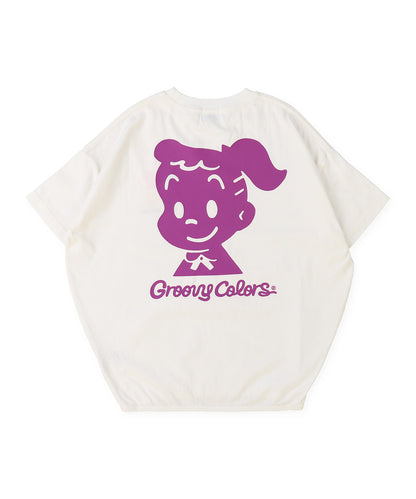 40/2天竺素材のバルーンシルエットTシャツ。左胸にカラフルなJACK・JILL・DOG・CATの刺繍。BACKにはJILLとGROOVY COLORSロゴを組み合わせたオリジナルグラフィックをプリント。裾を伸ばしたままでも、中に折り込んで着ても特徴的な丸いシルエットが楽しめます。