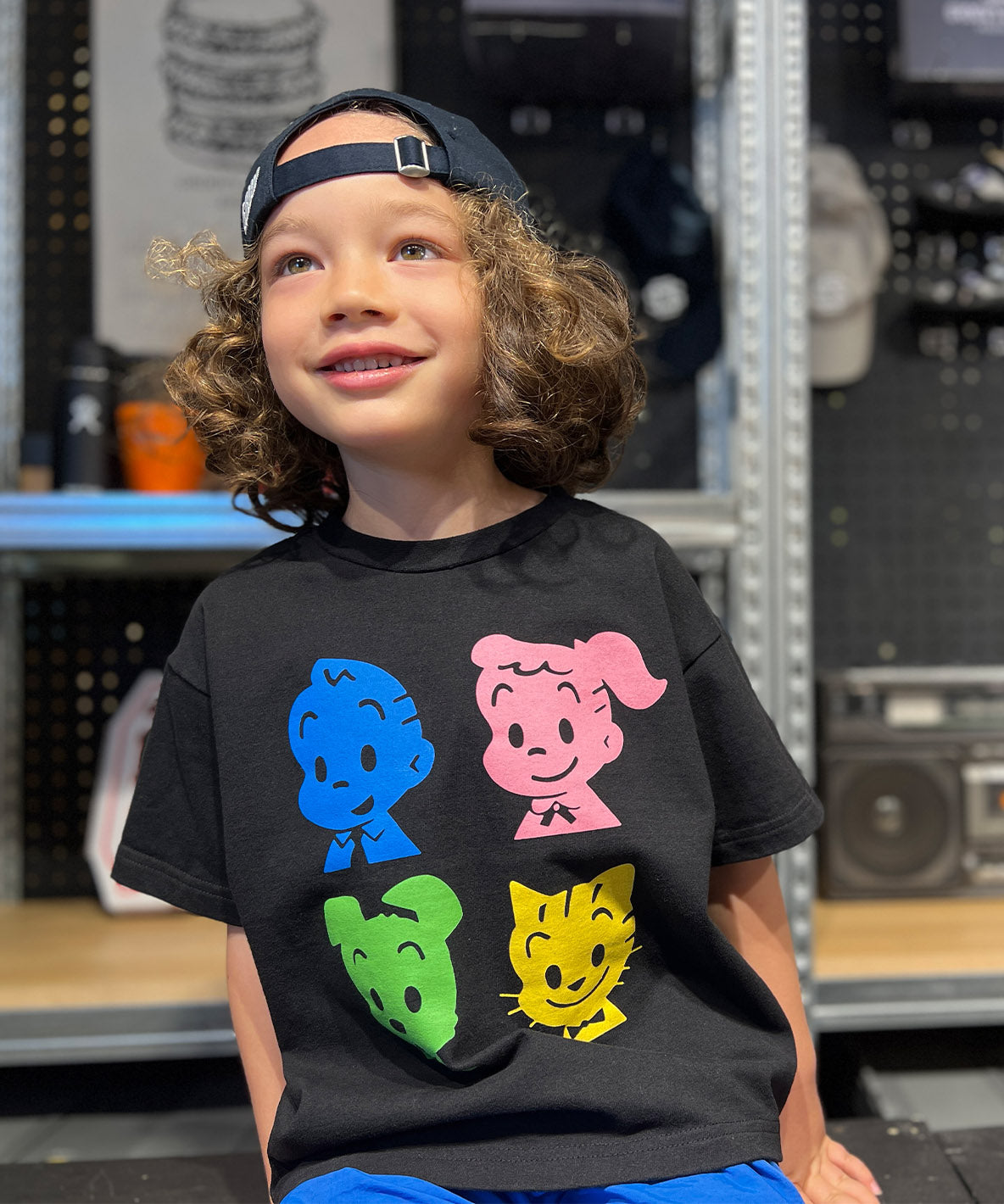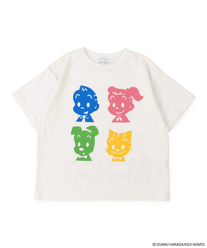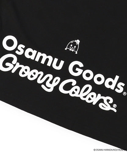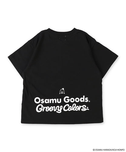 40/2天竺素材の半袖Tシャツ。GROOVY定番型のややゆったりとしたシルエット。FRONTにカラフルなJACK・JILL・DOG・CATのプリント。BACKにはOSAMU GOODSとGROOVY COLORSロゴを組み合わせたオリジナルグラフィックをプリント。ハンプティダンプティもポイントです。