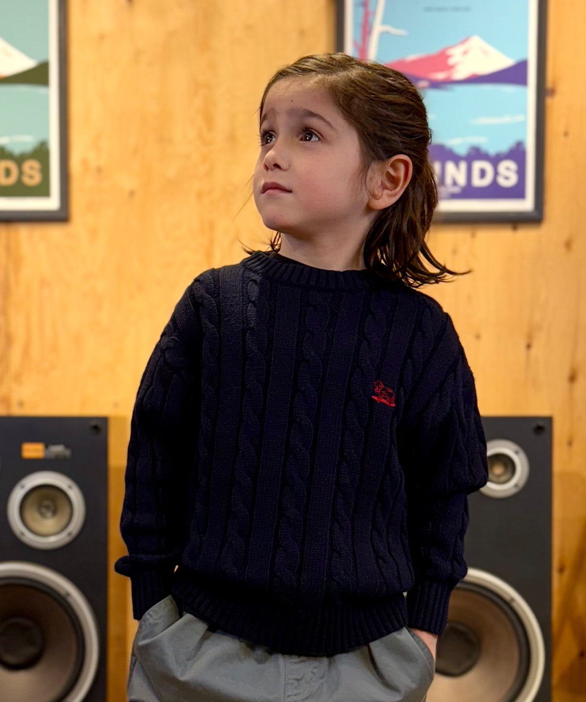 チクチクせず、お子様も着用しやすい綿100%のケーブル編みクルーネックニット。家庭洗濯可能。(洗濯ネット推奨)左胸にスケボー犬のキャラクターBUDDYのワンポイント刺繍。ケーブル柄のニットは1ランク上の上品感を感じさせるホリデーシーズンにおすすめのアイテム。