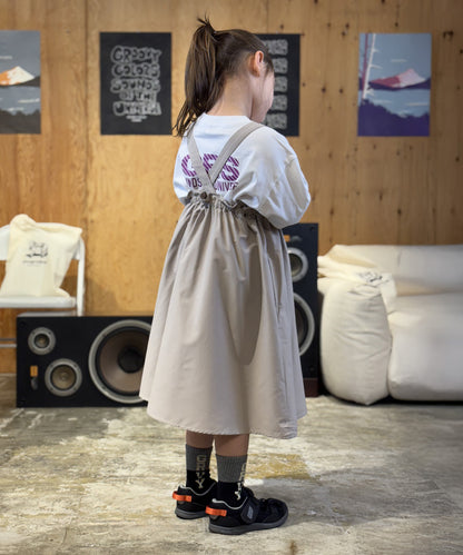 膝下ロング丈のサロペットスカートはハイウエストのフリルもアクセントに。機能的な素材をタウンユースなデザインに落とし込んだアクティブなワンピースになっています。