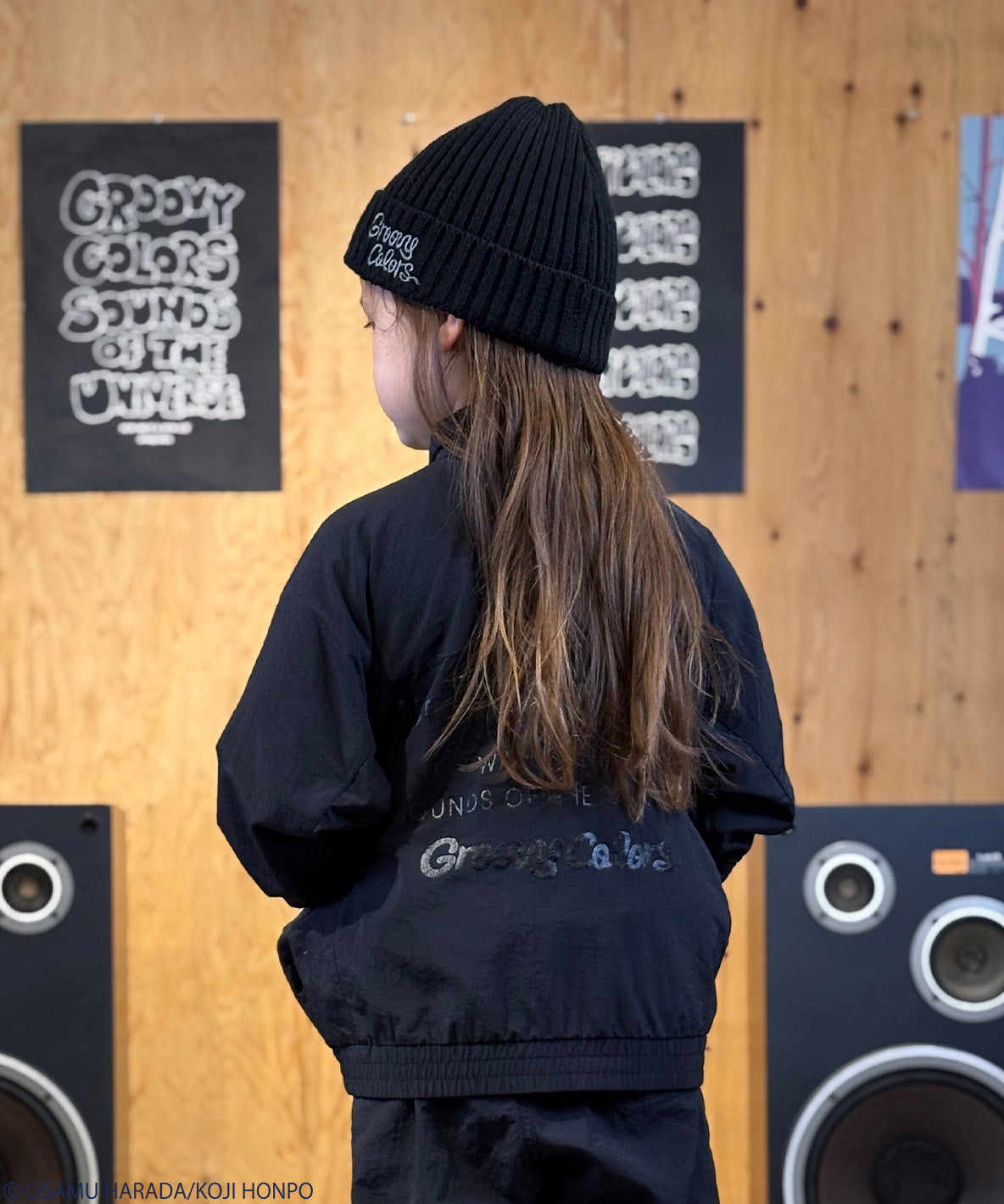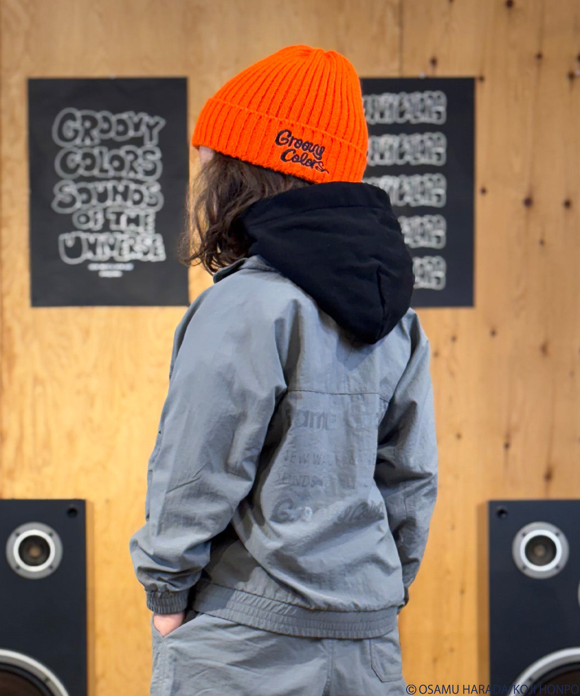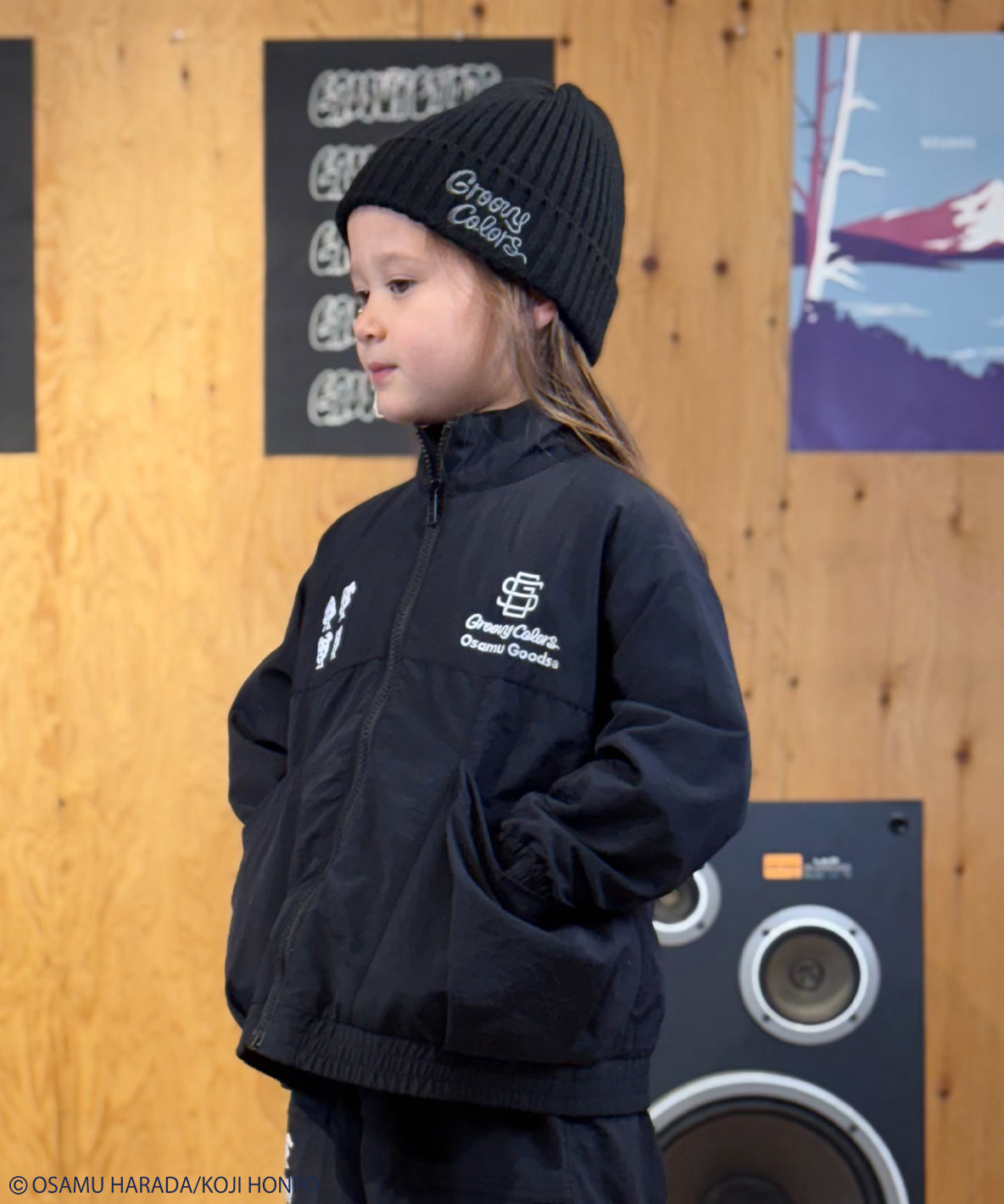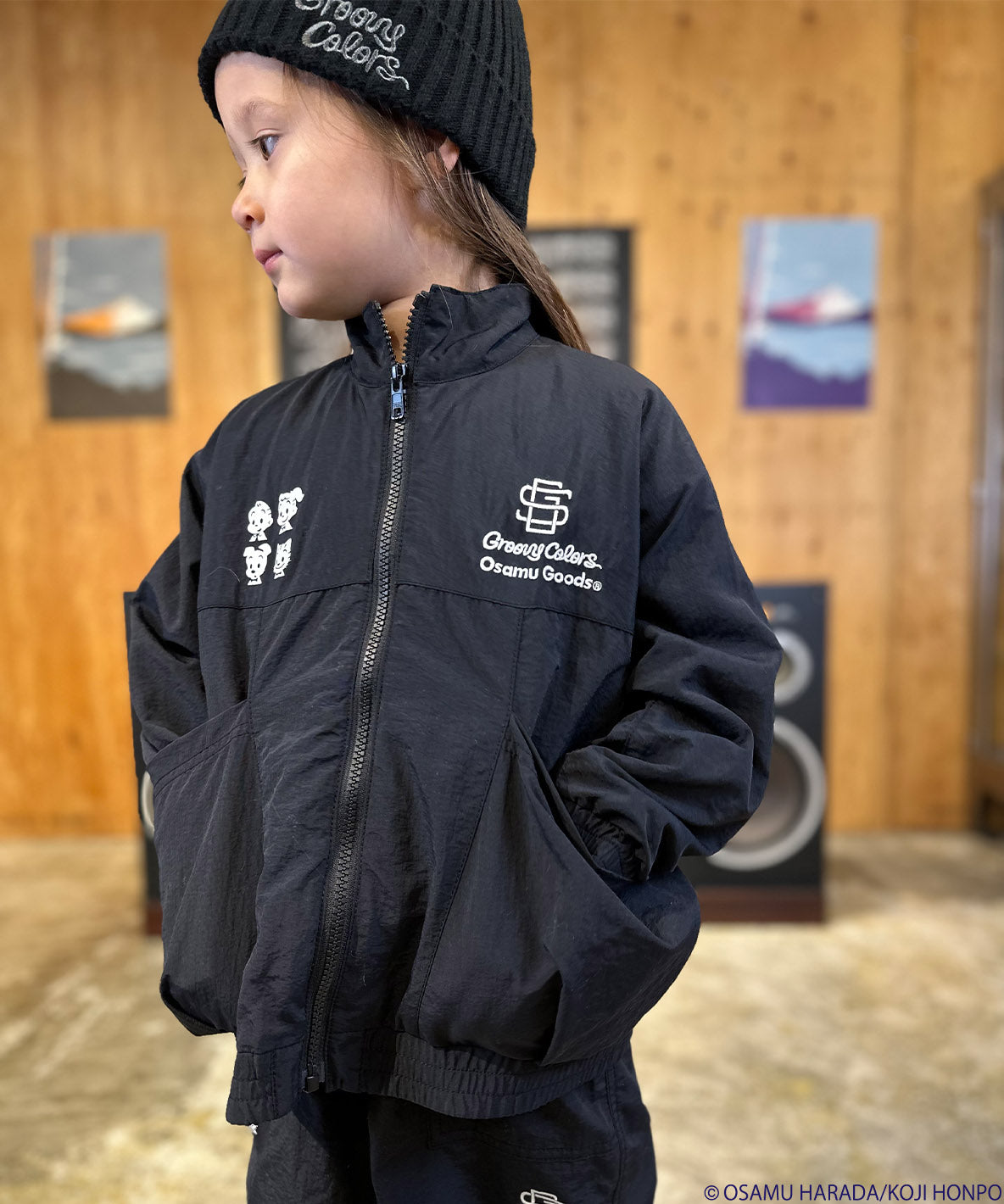 左右の大きなポケットが特徴、スポーツ+ワークウェア要素MIXのZIP UP ジャケット。左胸にブランドロゴのダブルネーム刺繍。右胸には JACK、JILL、DOG、CATの4キャラクターのプリント。BACKはOSAMU GOODSとGROOVY COLORSのロゴを配置したダブルネームの透明プリント。