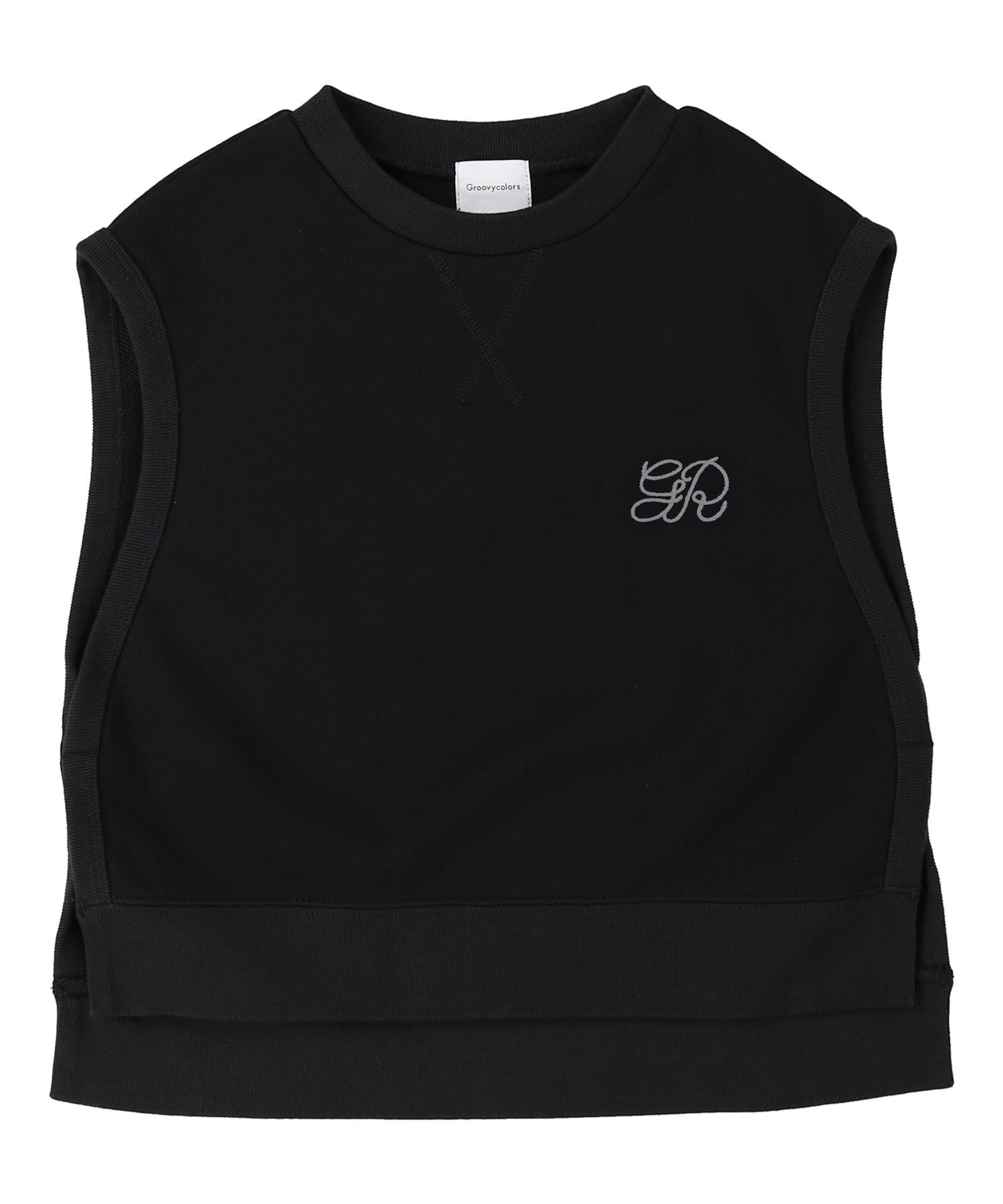 少し肩落ちするややゆったりとしたシルエットの裏毛素材のベスト。レイヤードスタイルを考え、サイドが大きく開いたデザインが特徴。左胸はgとRを組合せたロゴ刺繍。