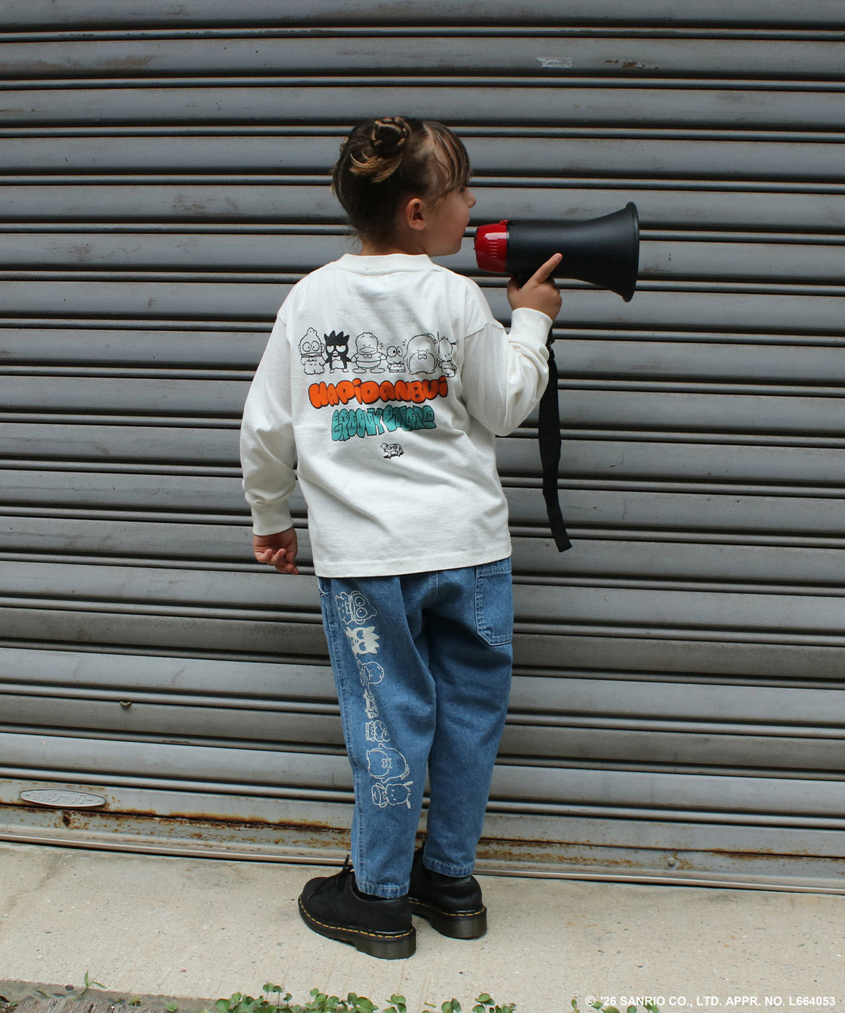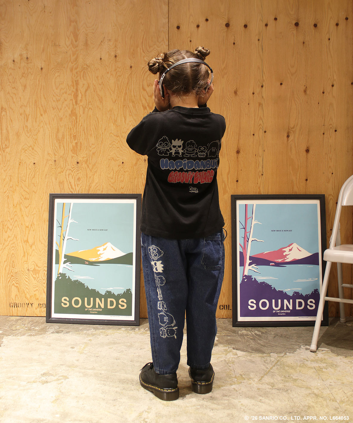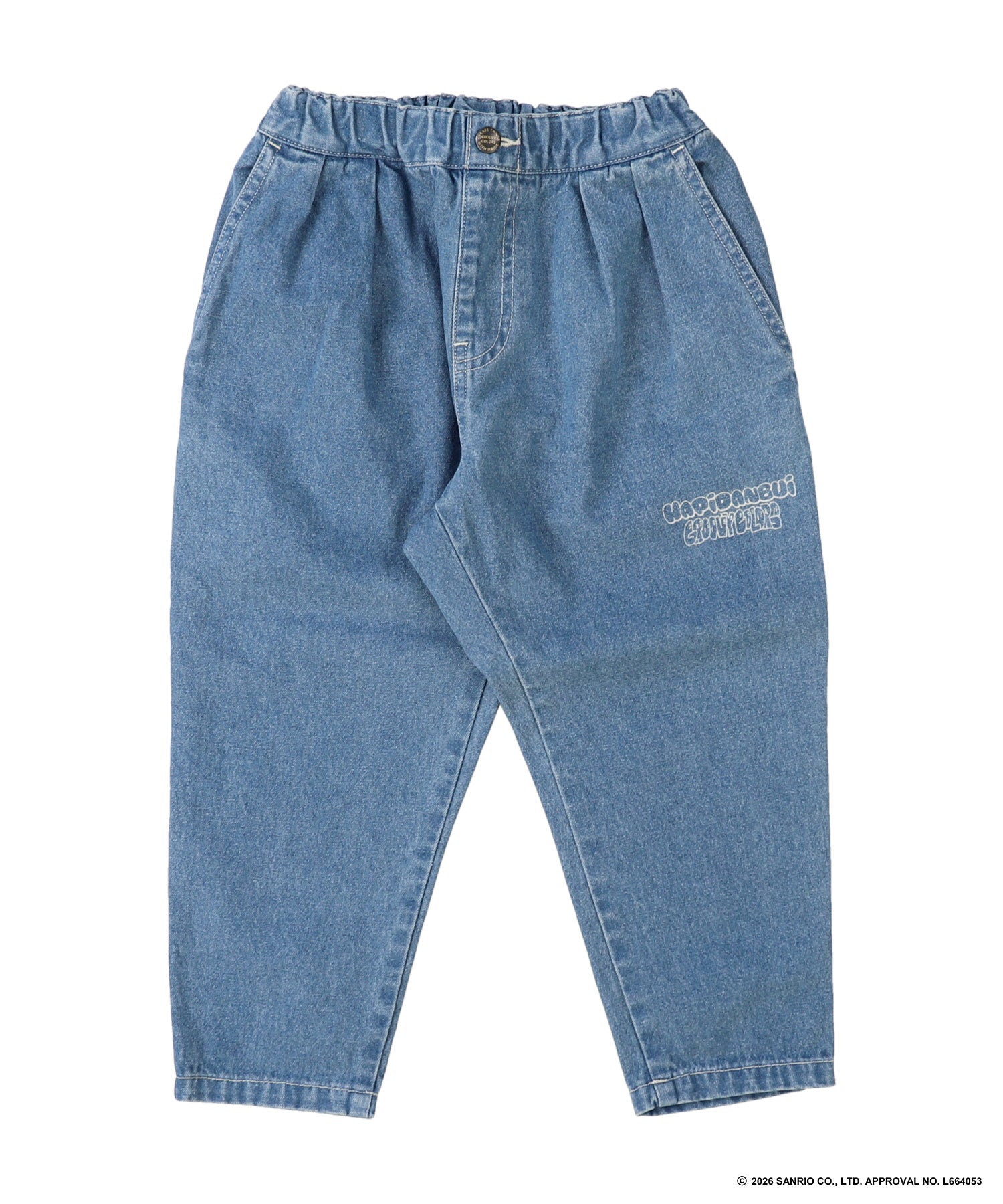 軽くて履きやすい8ozデニム素材。シルエットが綺麗な2タックテーパード型。左後ろに2020年に結成されたキャラクターユニットのぴだんぶいの抜染プリント。キャラクター達の中心には、GROOVY COLORSのブランドアイコンであるスケボー犬(BUDDY)も一緒に並んでいます。左前には、HAPIDANBUIのユニット名とGROOVY COLORSのブランドロゴの抜染プリント。